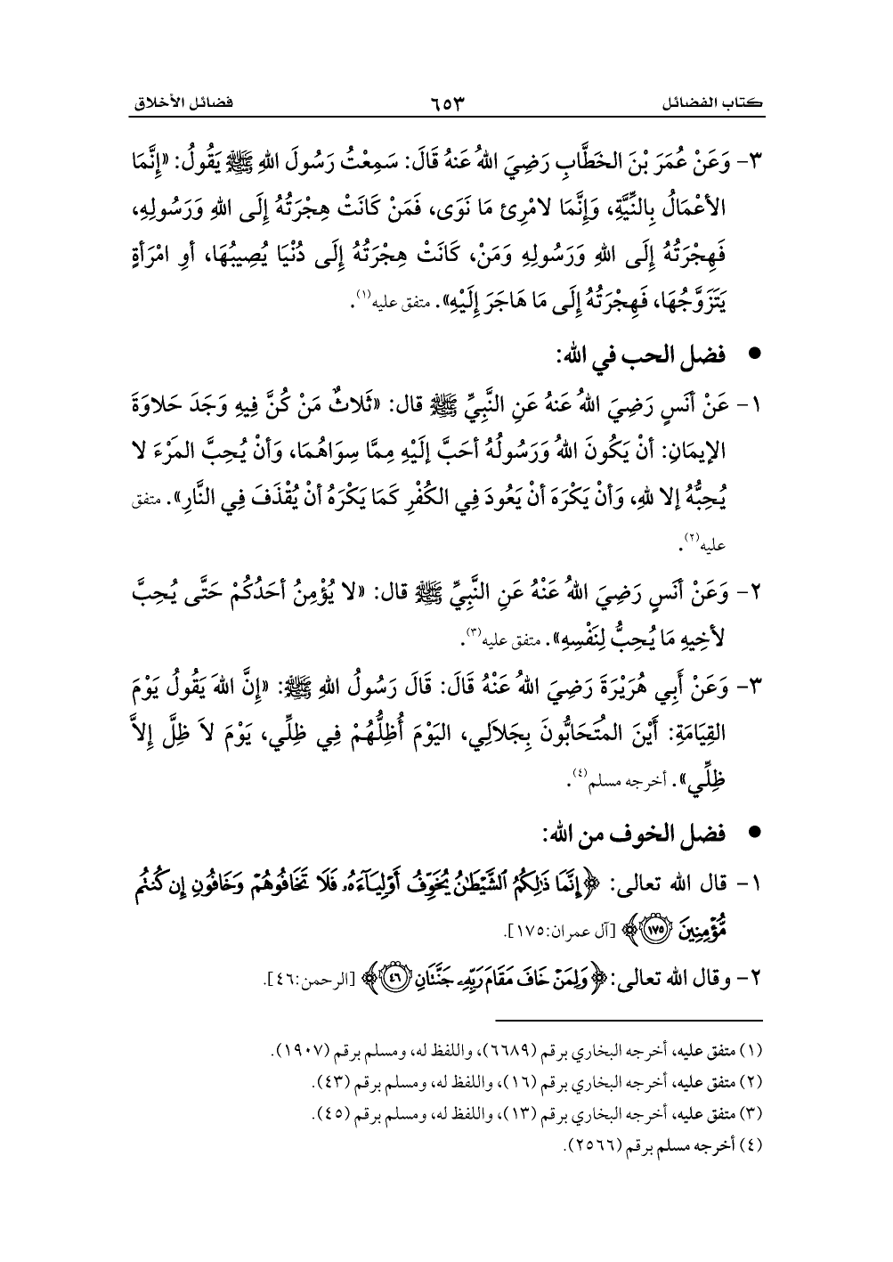 1 - عَنْ أنَسٍ رَضِيَ اللهُ عَنهُ عَنِ النَّبِيِّ - صلى الله عليه وسلم - قال: «ثَلاثٌ مَنْ كُنَّ فِيهِ وَجَدَ حَلاوَةَ الإيمَانِ: أنْ يَكُونَ اللهُ وَرَسُولُهُ أحَبَّ إلَيْهِ مِمَّا سِوَاهُمَا، وَأنْ يُحِبَّ المَرْءَ لا يُحِبُّهُ إلا للهِ، وَأنْ يَكْرَهَ أنْ يَعُودَ فِي الكُفْرِ كَمَا يَكْرَهُ أنْ يُقْذَفَ فِي النَّارِ». متفق عليه (¬2).