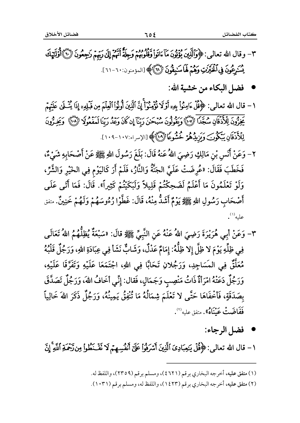 3 - وَعَنْ أبِي هُرَيْرَةَ رَضِيَ اللهُ عَنْهُ عَنِ النَّبِيِّ - صلى الله عليه وسلم - قالَ: «سَبْعَةٌ يُظِلُّهُمُ اللهُ تَعَالَى فِي ظِلِّهِ يَوْمَ لا ظِلَّ إِلا ظِلُّهُ: إِمَامٌ عَدْلٌ، وَشَابٌّ نَشَأ فِي عِبَادَةِ اللهِ، وَرَجُلٌ قَلْبُهُ مُعَلَّقٌ فِي المَسَاجِدِ، وَرَجُلانِ تَحَابَّا فِي اللهِ، اجْتَمَعَا عَلَيْهِ وَتَفَرَّقَا عَلَيْهِ، وَرَجُلٌ دَعَتْهُ امْرَأةٌ ذَاتُ مَنْصِبٍ وَجَمَالٍ، فَقال: إِنِّي أخَافُ اللهَ، وَرَجُلٌ تَصَدَّقَ بِصَدَقَةٍ، فَأخْفَاهَا حَتَّى لا تَعْلَمَ شِمَالُهُ مَا تُنْفِقُ يَمِينُهُ، وَرَجُلٌ ذَكَرَ اللهَ خَالِياً فَفَاضَتْ عَيْنَاهُ». متفق عليه (¬2).