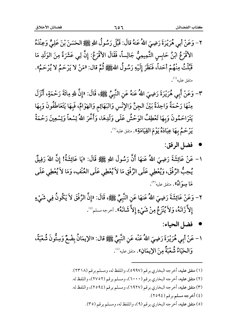 2 - وَعَنْ أبي هُرَيْرَةَ رَضِيَ اللهُ عَنهُ قالَ: قَبَّلَ رَسُولُ اللهِ - صلى الله عليه وسلم - الحَسَنَ بْنَ عَلِيٍّ وَعِنْدَهُ الأقْرَعُ ابْنُ حَابِسٍ التَّمِيمِيُّ جَالِساً، فَقَالَ الأقْرَعُ: إِنَّ لِي عَشَرَةً مِنَ الوَلَدِ مَا قَبَّلْتُ مِنْهُمْ أحَداً، فَنَظَرَ إِلَيْهِ رَسُولُ الله - صلى الله عليه وسلم - ثُمَّ قال: «مَنْ لا يَرْحَمُ لا يُرْحَمُ». متفق عليه (¬1).