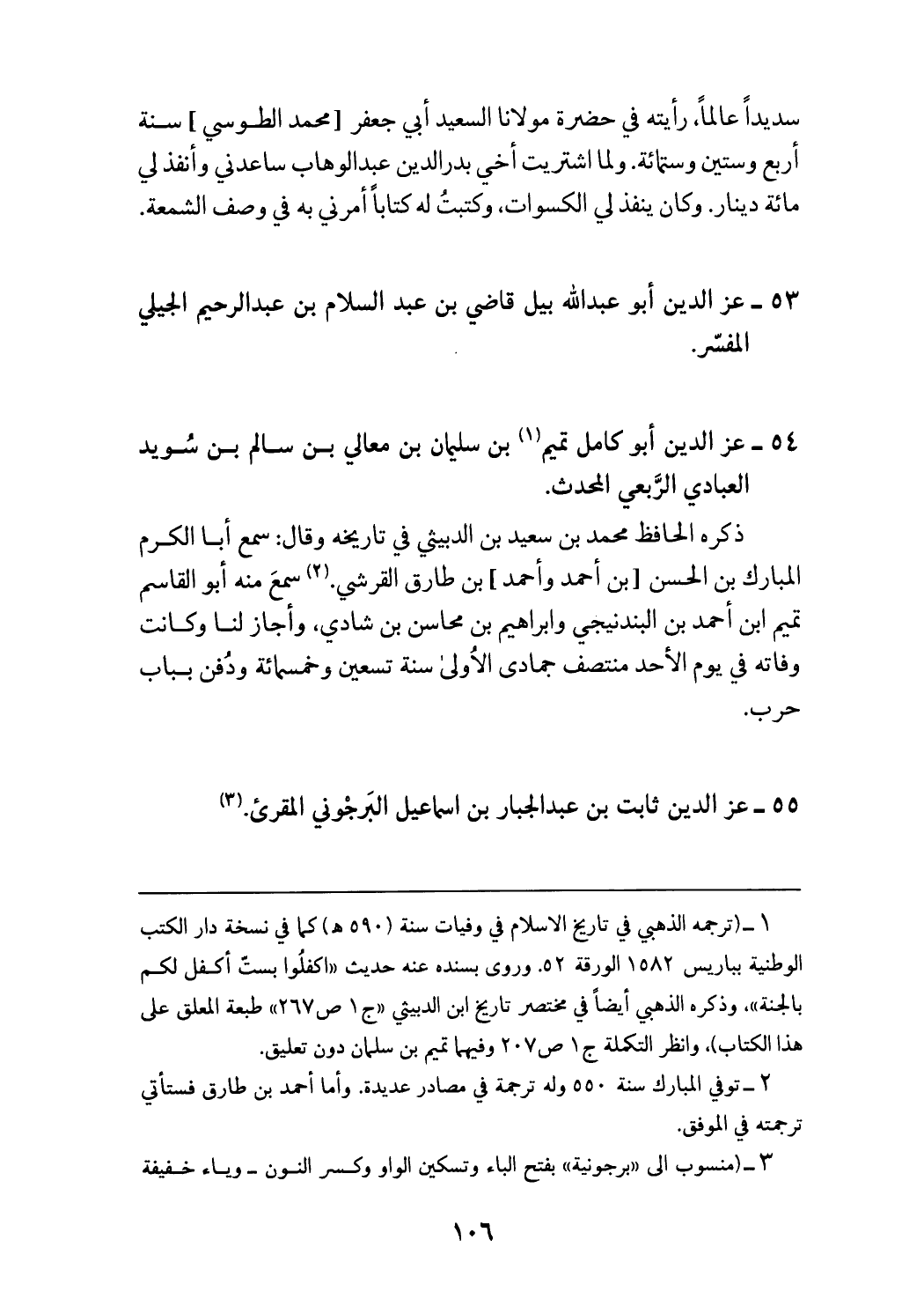(¬1) (ترجمه الذهبي في تاريخ الاسلام في وفيات سنة (590 هـ) كما في نسخة دار الكتب الوطنية بباريس 1582 الورقة 52.وروى بسنده عنه حديث «اكفلوا بستّ أكفل لكم بالجنة»، وذكره الذهبي أيضا في مختصر تاريخ ابن الدبيثي «ج 1 ص 267» طبعة المعلق على هذا الكتاب)، وانظر التكملة ج 1 ص 207 وفيهما تميم بن سلمان دون تعليق.
