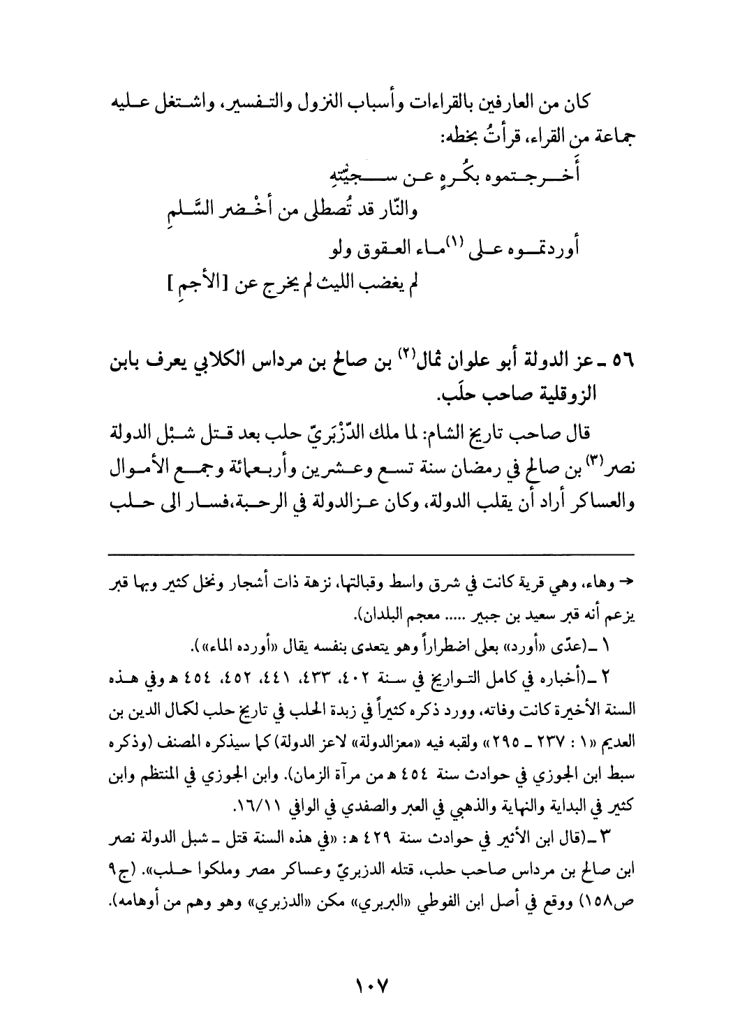 (¬2) (أخباره في كامل التواريخ في سنة 402، 433، 441، 452، 454 هـ وفي هذه السنة الأخيرة كانت وفاته، وورد ذكره كثيرا في زبدة الحلب في تاريخ حلب لكمال الدين بن العديم «1: 237 - 295» ولقبه فيه «معز الدولة» لا عز الدولة) كما سيذكره المصنف (وذكره سبط ابن الجوزي في حوادث سنة 454 هـ من مرآة الزمان). وابن الجوزي في المنتظم وابن كثير في البداية والنهاية والذهبي في العبر والصفدي في الوافي 16/ 11.