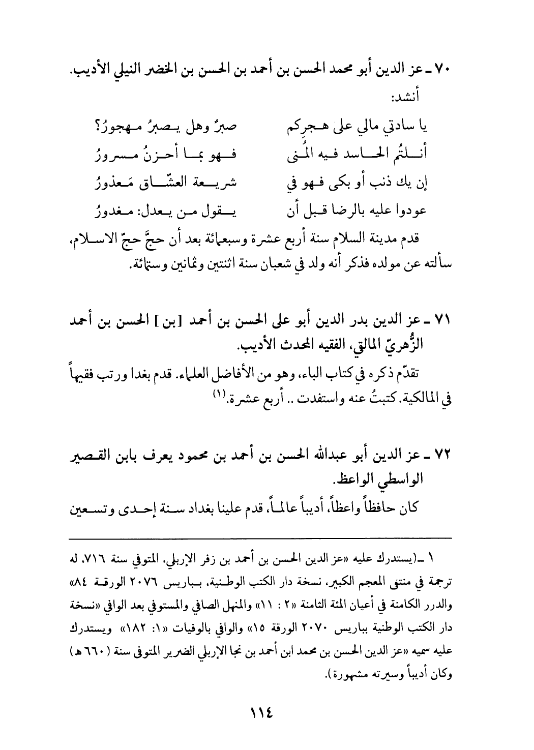(¬1) (يستدرك عليه «عزّ الدين الحسن بن أحمد بن زفر الإربلي، المتوفي سنة 716، له ترجمة في منتفى المعجم الكبير، نسخة دار الكتب الوطنية، بباريس 2076 الورقة 84» والدرر الكامنة في أعيان المائة الثامنة «2: 11» والمنهل الصافي والمستوفي بعد الوافي «نسخة دار الكتب الوطنية بباريس 2070 الورقة 15» والوافي بالوفيات «1: 182» ويستدرك عليه سميه «عزّ الدين الحسن بن محمد ابن أحمد بن نجا الإربلي الضرير المتوفى سنة (660 هـ) وكان أديبا وسيرته مشهورة).