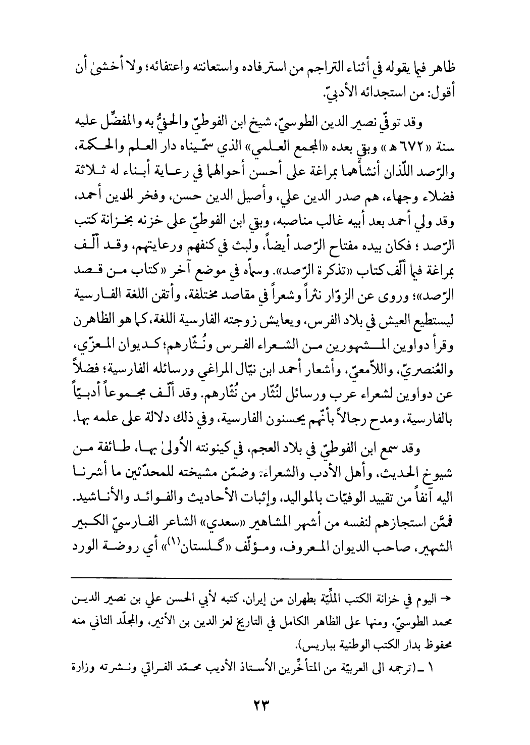 فممّن استجازهم لنفسه من أشهر المشاهير «سعدي» الشاعر الفارسيّ الكبير الشهير، صاحب الديوان المعروف، ومؤلّف «كلستان (¬1)» أي روضة الورد