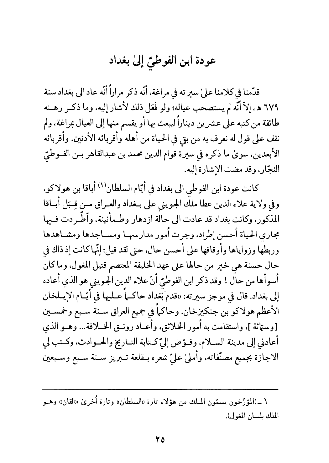 كانت عودة ابن الفوطي الى بغداد في أيّام السلطان (¬1) أباقا بن هولاكو، وفي ولاية علاء الدين عطا ملك الجويني على بغداد والعراق من قبل أباقا المذكور، وكانت بغداد قد عادت الى حالة ازدهار وطمأنينة، واطّردت فيها مجاري الحياة أحسن اطراد، وجرت امور مدارسها ومساجدها ومشاهدها وربطها وزواياها وأوقافها على أحسن حال، حتى لقد قيل: إنّها كانت إذ ذاك في حال حسنة هي خير من حالها على عهد الخليفة المعتصم قتيل المغول، وما كان أسوأها من حال! وقد ذكر ابن الفوطيّ أنّ علاء الدين الجويني هو الذي أعاده إلى بغداد. قال في موجز سيرته: «قدم بغداد حاكما عليها في أيّام الإيلخان الأعظم هولاكو بن جنكيز خان، وحاكما في جميع العراق سنة سبع وخمسين [وستمائة]، واستقامت به امور الخلائق، وأعاد رونق الخلافة ... وهو الذي أعادني إلى مدينة السلام، وفوّض إليّ كتابة التاريخ والحوادث، وكتب لي الاجازة بجميع مصنّفاته، وأملى عليّ شعره بقلعة تبريز سنة سبع وسبعين