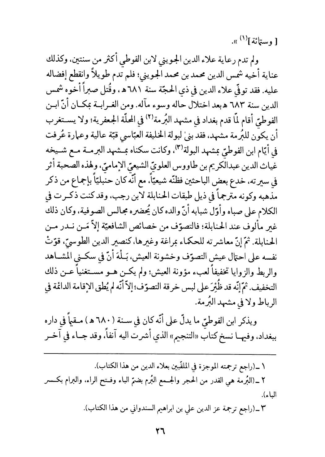 ولم تدم رعاية علاء الدين الجويني لابن الفوطي أكثر من سنتين، وكذلك عناية أخيه شمس الدين محمد بن محمد الجويني؛ فلم تدم طويلا وانقطع إفضاله عليه. فقد توفّي علاء الدين في ذي الحجّة سنة 681 هـ، وقتل صبرا أخوه شمس الدين سنة 683 هـ بعد اختلال حاله وسوء مآله. ومن الغرابة بمكان أنّ ابن الفوطيّ أقام لمّا قدم بغداد في مشهد البرمة (¬2) في المحلّة الجعفرية؛ ولا يستغرب أن يكون للبرمة مشهد، فقد بنى لبولة الخليفة العبّاسي قبّة عالية وعمارة عرفت في أيّام ابن الفوطيّ بمشهد البولة (¬3)، وكانت سكناه بمشهد البرمة مع شيخه غياث الدين عبد الكريم بن طاوس العلويّ الشيعيّ الإماميّ، ولهذه الصحبة أثر في سيرته، خدع بعض الباحثين فظنّه شيعيّا، مع أنّه كان حنبليّا بإجماع من ذكر مذهبه وكونه مترجما في ذيل طبقات الحنابلة لابن رجب، وقد كنت ذكرت في الكلام على صباه وأوّل شبابه أنّ والده كان يحضره مجالس الصوفية، وكان ذلك غير مألوف عند الحنابلة؛ فالتصوّف من خصائص الشافعيّة إلاّ من ندر من الحنابلة. ثمّ إنّ معاشرته للحكماء بمراغة وغيرها، كنصير الدين الطوسيّ، قوّت نفسه على احتمال عيش التصوّف وخشونة العيش، بله أنّ في سكنى المشاهد والربط والزوايا تخفيفا لعبء مؤونة العيش؛ ولم يكن هو مستغنيا عن ذلك التخفيف. ثمّ إنّه قد ظئر على لبس خرقة التصوّف؛ إلاّ أنّه لم يطق الإقامة الدائمة في الرباط ولا في مشهد البرمة.
