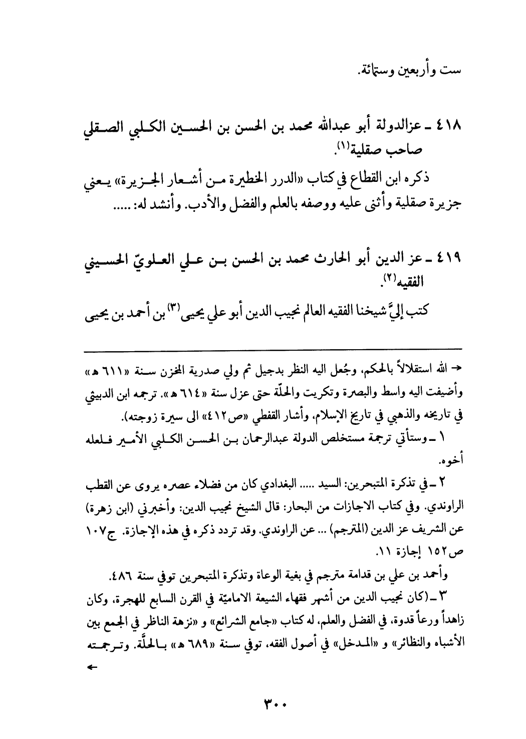 (¬2) في تذكرة المتبحرين: السيد ... البغدادي كان من فضلاء عصره يروى عن القطب الراوندي. وفي كتاب الاجازات من البحار: قال الشيخ نجيب الدين: وأخبرني (ابن زهرة) عن الشريف عزّ الدين (المترجم) ... عن الراوندي. وقد تردد ذكره في هذه الإجازة. ج 107 ص 152 إجازة 11. وأحمد بن علي بن قدامة مترجم في بغية الوعاة وتذكرة المتبحرين توفي سنة 486.