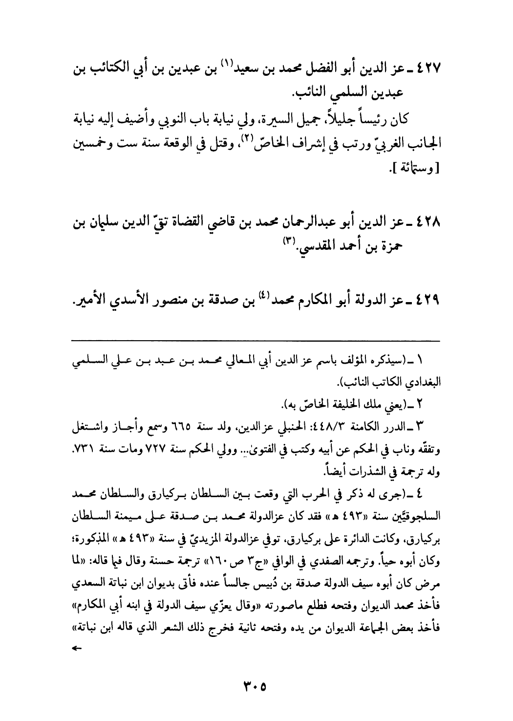 429 - عز الدولة أبو المكارم محمد (¬4) بن صدقة بن منصور الأسدي الأمير.