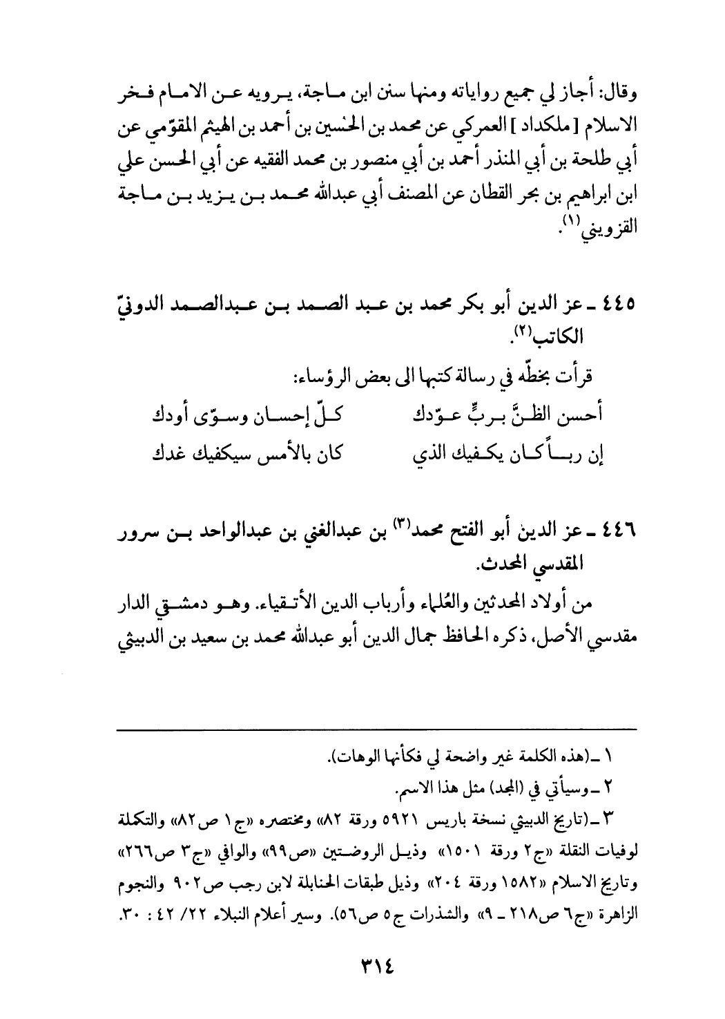 (¬3) (تاريخ الدبيثي نسخة باريس 5921 ورقة 82» ومختصره «ج 1 ص 82» والتكملة لوفيات النقلة «ج 2 ورقة 1501» وذيل الروضتين «ص 99» والوافي «ج 3 ص 266» وتاريخ الاسلام «1582 ورقة 204» وذيل طبقات الحنابلة لابن رجب ص 902 والنجوم الزاهرة «ج 6 ص 218 - 9» والشذرات ج 5 ص 56). وسير أعلام النبلاء 42/ 22: 30.