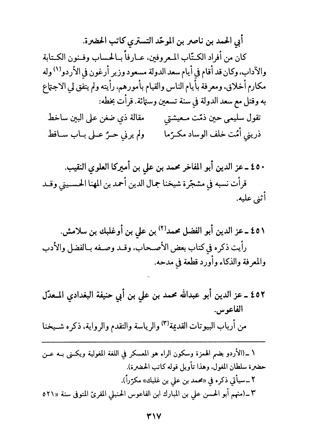 كان من أفراد الكتّاب المعروفين، عارفا بالحساب وفنون الكتابة والآداب، وكان قد أقام في أيام سعد الدولة مسعود وزير أرغون في الأردو (¬1) وله مكارم أخلاق، ومعرفة بأيام الناس والقيام بأمورهم، رأيته ولم يتفق لي الاجتماع به وقتل مع سعد الدولة في سنة تسعين وستمائة. قرأت بخطه: