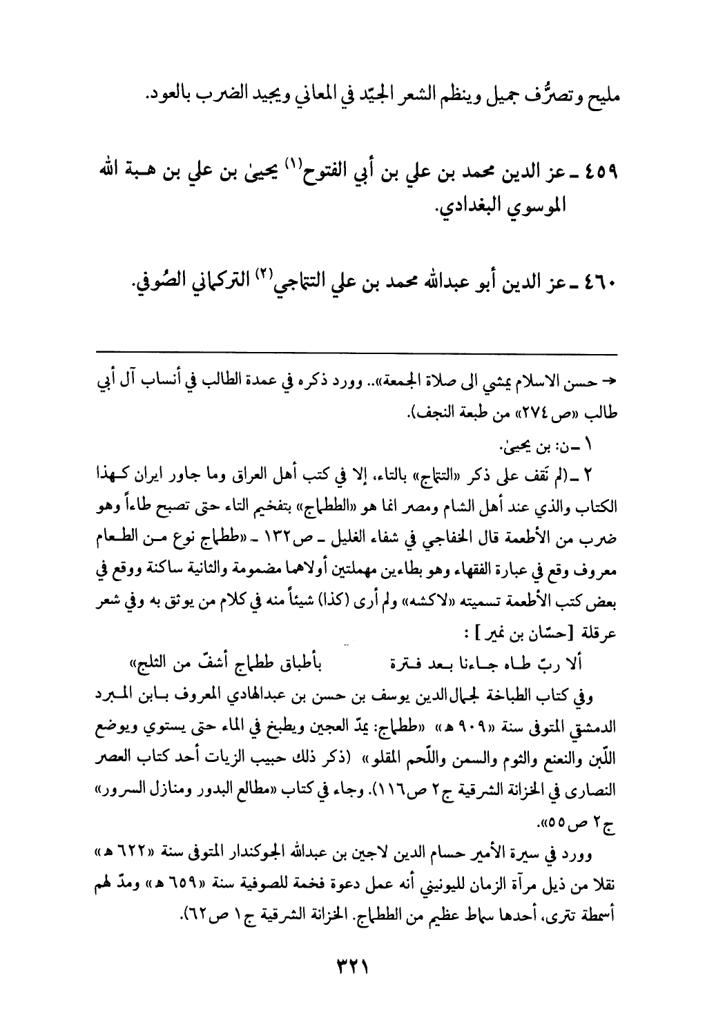 (¬2) (لم نقف على ذكر «التتماج» بالتاء، إلا في كتب أهل العراق وما جاور ايران كهذا الكتاب والذي عند أهل الشام ومصر انما هو «الططماج» بتفخيم التاء حتى تصبح طاء وهو ضرب من الأطعمة قال الخفاجي في شفاء الغليل - ص 132 - «ططماج نوع من الطعام معروف وقع في عبارة الفقهاء وهو بطاءين مهملتين أولاهما مضمومة والثانية ساكنة ووقع في بعض كتب الأطعمة تسميته «لاكشه» ولم أرى (كذا) شيئا منه في كلام من يوثق به وفي شعر عرقلة [حسّان بن نمير]:
