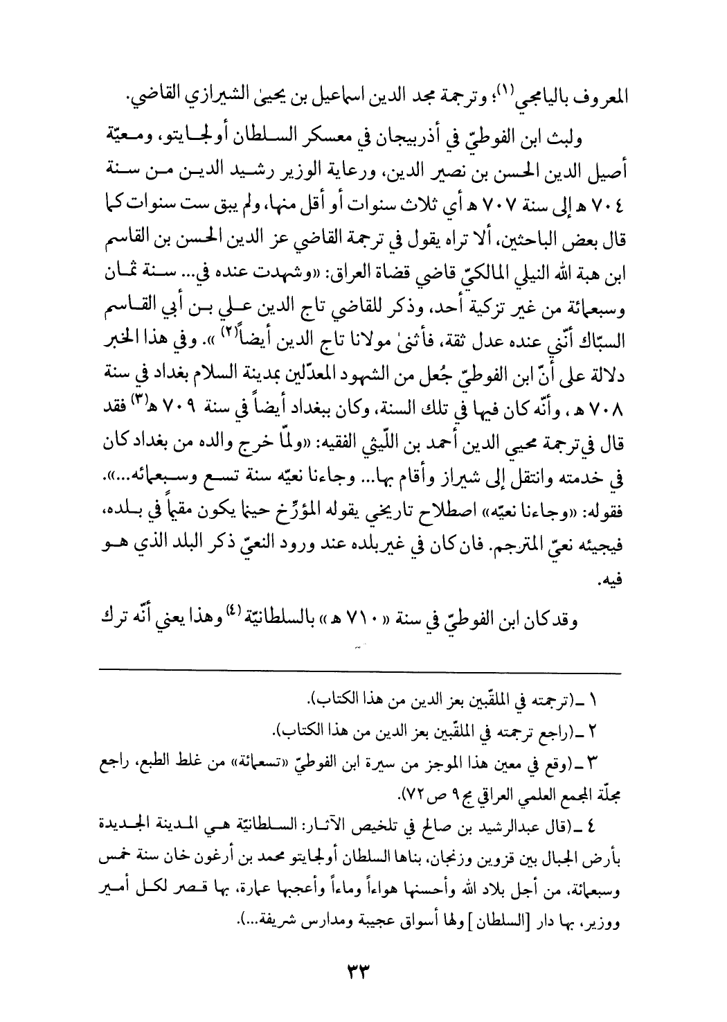 وقد كان ابن الفوطيّ في سنة «710 هـ» بالسلطانيّة (¬4) وهذا يعني أنّه ترك