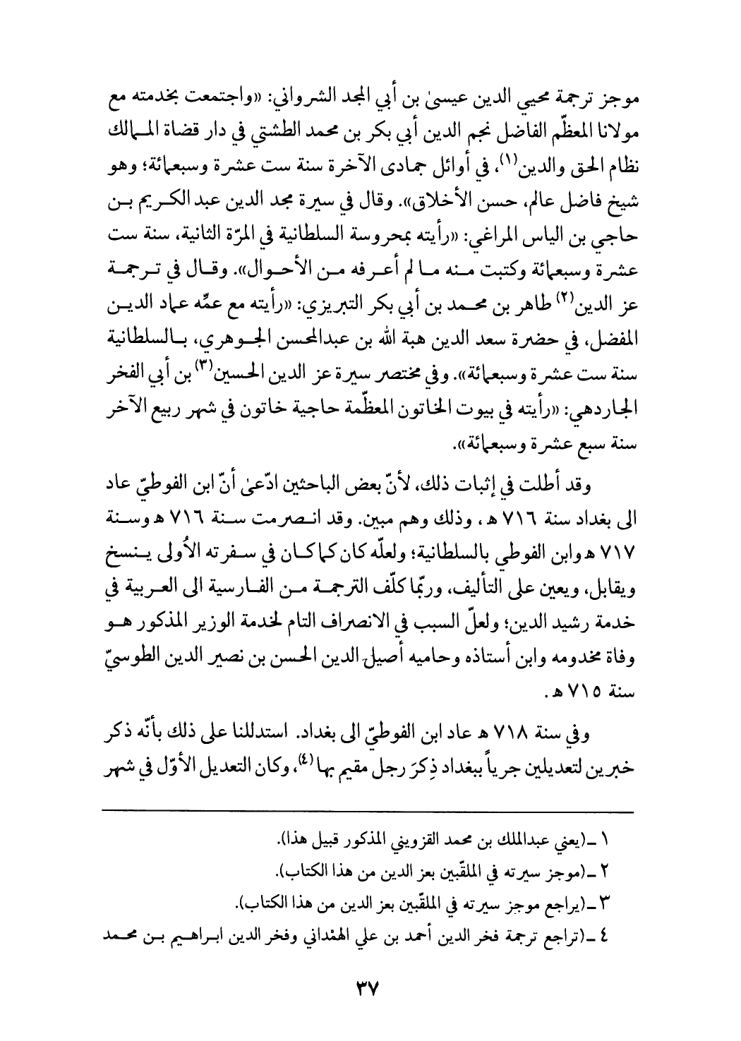 وقد أطلت في إثبات ذلك، لأنّ بعض الباحثين ادّعى أنّ ابن الفوطيّ عاد الى بغداد سنة 716 هـ، وذلك وهم مبين. وقد انصرمت سنة 716 هـ وسنة 717 هـ وابن الفوطي بالسلطانية؛ ولعلّه كان كما كان في سفرته الاولى ينسخ ويقابل، ويعين على التأليف، وربّما كلّف الترجمة من الفارسية الى العربية في خدمة رشيد الدين؛ ولعلّ السبب في الانصراف التام لخدمة الوزير المذكور هو وفاة مخدومه وابن أستاذه وحاميه أصيل الدين الحسن بن نصير الدين الطوسيّ سنة 715 هـ.