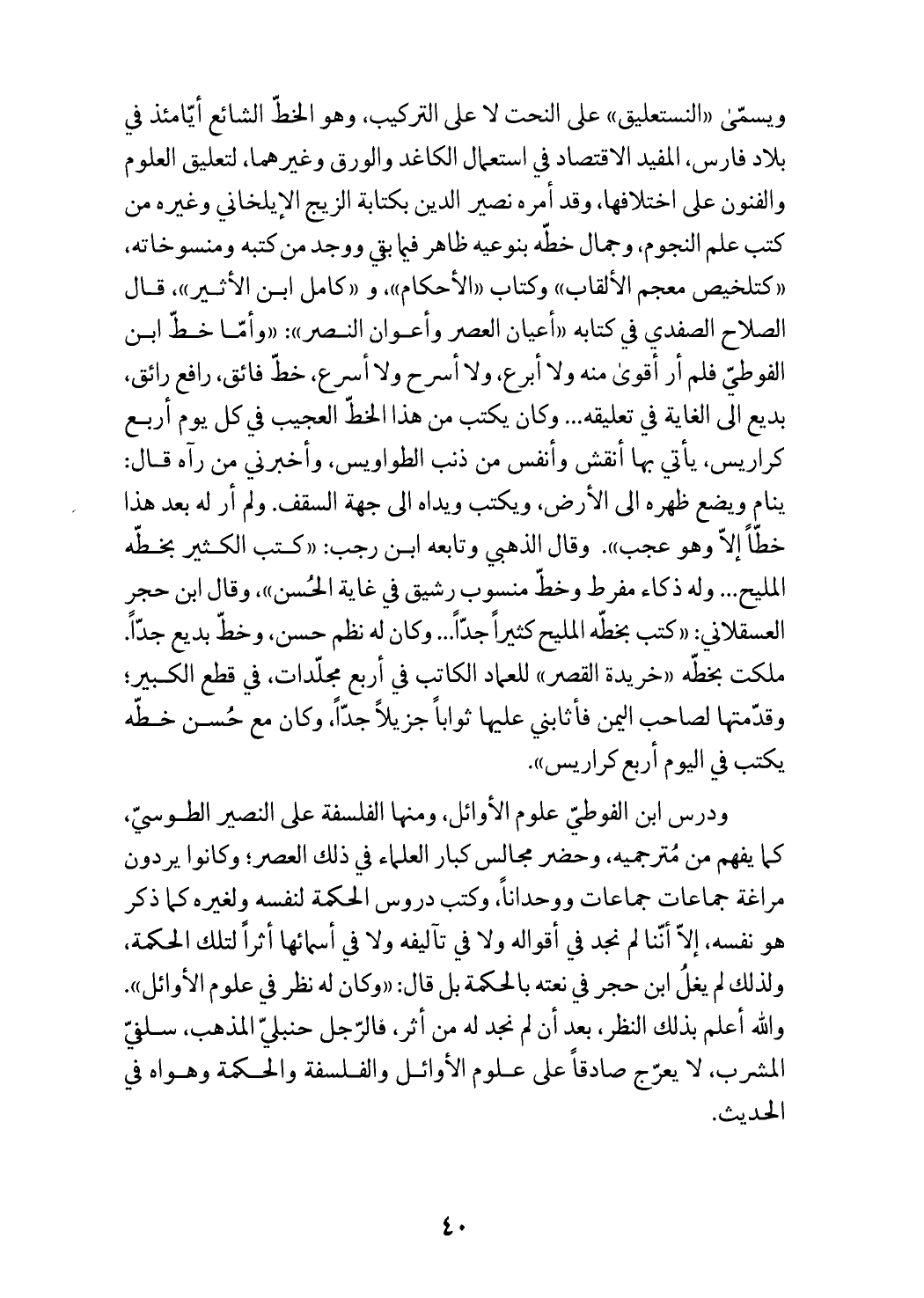 ويسمّى «النستعليق» على النحت لا على التركيب، وهو الخطّ الشائع أيّامئذ في بلاد فارس، المفيد الاقتصاد في استعمال الكاغد والورق وغيرهما، لتعليق العلوم والفنون على اختلافها، وقد أمره نصير الدين بكتابة الزيج الإيلخاني وغيره من كتب علم النجوم، وجمال خطّه بنوعيه ظاهر فيما بقي ووجد من كتبه ومنسوخاته، «كتلخيص معجم الألقاب» وكتاب «الأحكام»، و «كامل ابن الأثير»، قال الصلاح الصفدي في كتابه «أعيان العصر وأعوان النصر»: «وأمّا خطّ ابن الفوطيّ فلم أر أقوى منه ولا أبرع، ولا أسرح ولا أسرع، خطّ فائق، رافع رائق، بديع الى الغاية في تعليقه ... وكان يكتب من هذا الخطّ العجيب في كل يوم أربع كراريس، يأتي بها أنقش وأنفس من ذنب الطواويس، وأخبرني من رآه قال: