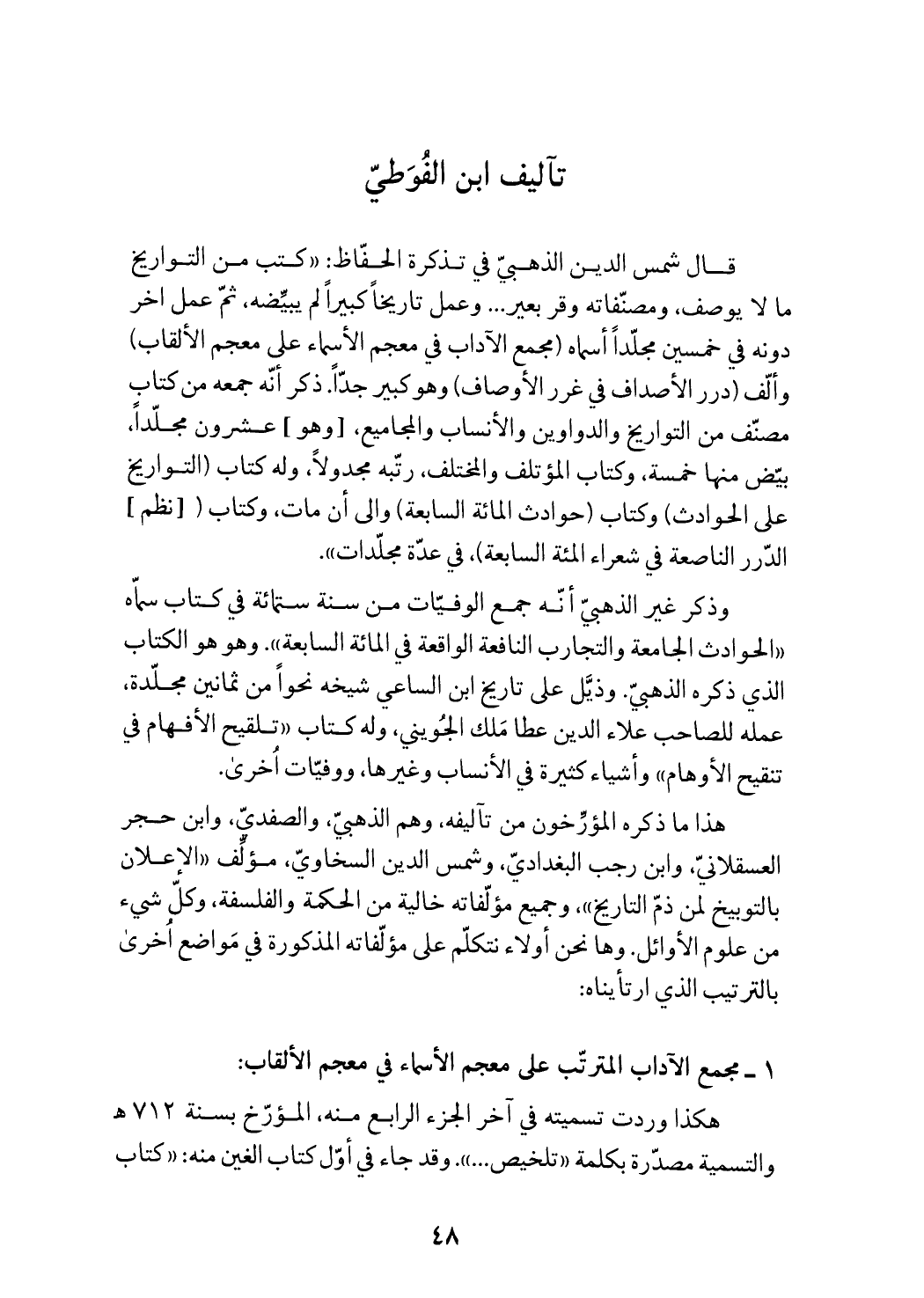 قال شمس الدين الذهبيّ في تذكرة الحفّاظ: «كتب من التواريخ ما لا يوصف، ومصنّفاته وقر بعير ... وعمل تاريخا كبيرا لم يبيّضه، ثمّ عمل اخر دونه في خمسين مجلّدا أسماه (مجمع الآداب في معجم الأسماء على معجم الألقاب) وألّف (درر الأصداف في غرر الأوصاف) وهو كبير جدّا. ذكر أنّه جمعه من كتاب مصنّف من التواريخ والدواوين والأنساب والمجاميع، [وهو] عشرون مجلّدا، بيّض منها خمسة، وكتاب المؤتلف والمختلف، رتّبه مجدولا، وله كتاب (التواريخ على الحوادث) وكتاب (حوادث المائة السابعة) والى أن مات، وكتاب ([نظم] الدّرر الناصعة في شعراء المائة السابعة)، في عدّة مجلّدات».