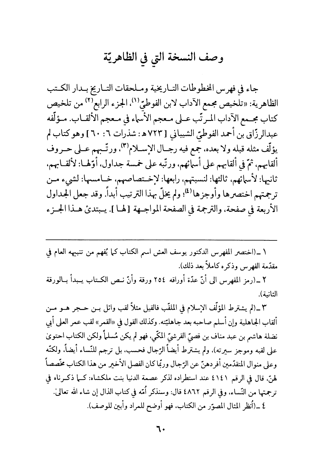 جاء في فهرس المخطوطات التاريخية وملحقات التاريخ بدار الكتب الظاهرية: «تلخيص مجمع الآداب لابن الفوطيّ (¬1)، الجزء الرابع (¬2) من تلخيص كتاب مجمع الآداب المرتّب على معجم الأسماء في معجم الألقاب. مؤلّفه عبد الرزّاق بن أحمد الفوطيّ الشيباني [723 هـ: شذرات 6: 60] وهو كتاب لم يؤلّف مثله قبله ولا بعده، جمع فيه رجال الإسلام (¬3)، ورتّبهم على حروف ألقابهم، ثمّ في ألقابهم على أسمائهم، ورتّبه على خمسة جداول، أوّلها: لألقابهم، ثانيها: لأسمائهم، ثالثها: لنسبتهم، رابعها: لاختصاصهم، خامسها: لشيء من ترجمتهم اختصرها وأوجزها (¬4)؛ ولم يخلّ بهذا الترتيب أبدا. وقد جعل الجداول الأربعة في صفحة، والترجمة في الصفحة المواجهة [لها].يبتدئ هذا الجزء