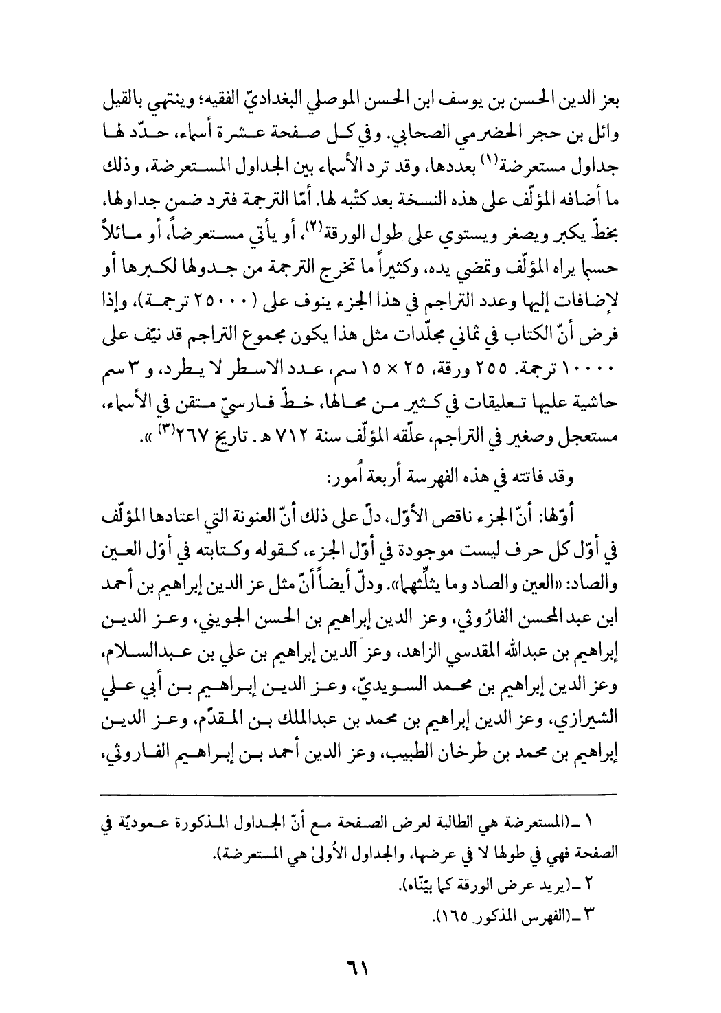 بعز الدين الحسن بن يوسف ابن الحسن الموصلي البغداديّ الفقيه؛ وينتهي بالقيل وائل بن حجر الحضرمي الصحابي. وفي كل صفحة عشرة أسماء، حدّد لها جداول مستعرضة (¬1) بعددها، وقد ترد الأسماء بين الجداول المستعرضة، وذلك ما أضافه المؤلّف على هذه النسخة بعد كتبه لها. أمّا الترجمة فترد ضمن جداولها، بخطّ يكبر ويصغر ويستوي على طول الورقة (¬2)، أو يأتي مستعرضا، أو مائلا حسبما يراه المؤلّف وتمضي يده، وكثيرا ما تخرج الترجمة من جدولها لكبرها أو لإضافات إليها وعدد التراجم في هذا الجزء ينوف على (25000 ترجمة)، وإذا فرض أنّ الكتاب في ثماني مجلّدات مثل هذا يكون مجموع التراجم قد نيّف على 10000 ترجمة.255 ورقة، 25 * 15 سم، عدد الاسطر لا يطرد، و 3 سم حاشية عليها تعليقات في كثير من محالها، خطّ فارسيّ متقن في الأسماء، مستعجل وصغير في التراجم، علّقه المؤلّف سنة 712 هـ.تاريخ 267 (¬3)».