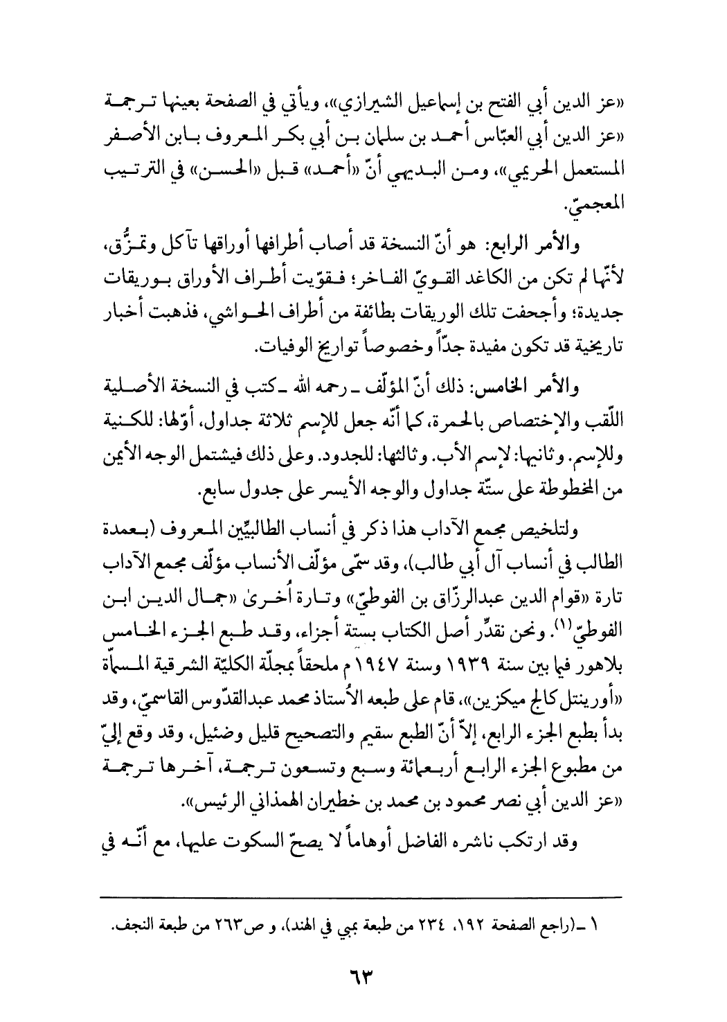 ولتلخيص مجمع الآداب هذا ذكر في أنساب الطالبيّين المعروف (بعمدة الطالب في أنساب آل أبي طالب)، وقد سمّى مؤلّف الأنساب مؤلّف مجمع الآداب تارة «قوام الدين عبد الرزّاق بن الفوطيّ» وتارة اخرى «جمال الدين ابن الفوطيّ (¬1). ونحن نقدّر أصل الكتاب بستة أجزاء، وقد طبع الجزء الخامس بلاهور فيما بين سنة 1939 وسنة 1947 م ملحقا بمجلّة الكليّة الشرقية المسماة «أورينتل كالج ميكزين»، قام على طبعه الاستاذ محمد عبد القدّوس القاسميّ، وقد بدأ بطبع الجزء الرابع، إلاّ أنّ الطبع سقيم والتصحيح قليل وضئيل، وقد وقع إليّ من مطبوع الجزء الرابع أربعمائة وسبع وتسعون ترجمة، آخرها ترجمة «عزّ الدين أبي نصر محمود بن محمد بن خطيران الهمذاني الرئيس».