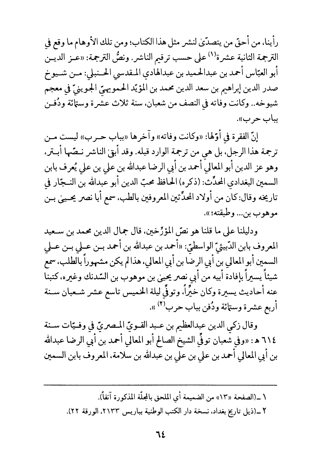 (¬2) (ذيل تاريخ بغداد، نسخة دار الكتب الوطنية بباريس 2133، الورقة 22).