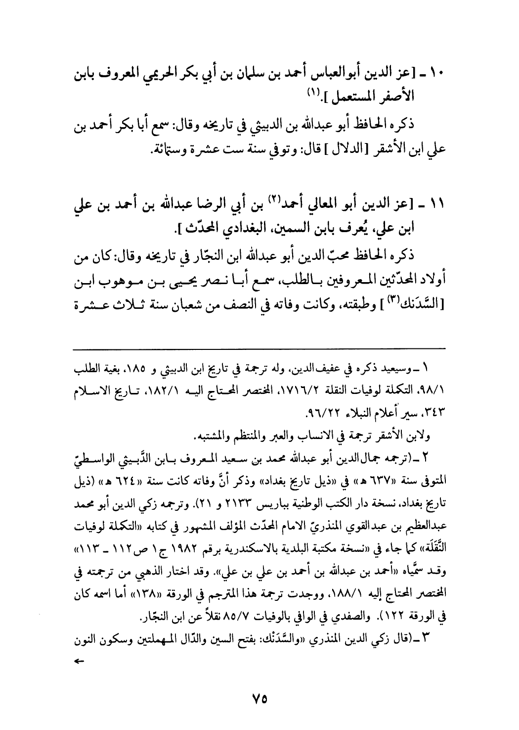 (¬2) (ترجمه جمال الدين أبو عبد الله محمد بن سعيد المعروف بابن الدّبيثي الواسطيّ المتوفى سنة «637 هـ» في «ذيل تاريخ بغداد» وذكر أنّ وفاته كانت سنة «624 هـ» (ذيل تاريخ بغداد، نسخة دار الكتب الوطنية بباريس 2133 و 21). وترجمه زكي الدين أبو محمد عبد العظيم بن عبد القوي المنذريّ الامام المحدّث المؤلف المشهور في كتابه «التكملة لوفيات النّقلة» كما جاء في «نسخة مكتبة البلدية بالاسكندرية برقم 1982 ج 1 ص 112 - 113» وقد سمّياه «أحمد بن عبد الله بن أحمد بن علي بن علي».وقد اختار الذهبي من ترجمته في المختصر المحتاج إليه 188/ 1، ووجدت ترجمة هذا المترجم في الورقة «138» أما اسمه كان في الورقة 122). والصفدي في الوافي بالوفيات 85/ 7 نقلا عن ابن النجّار.