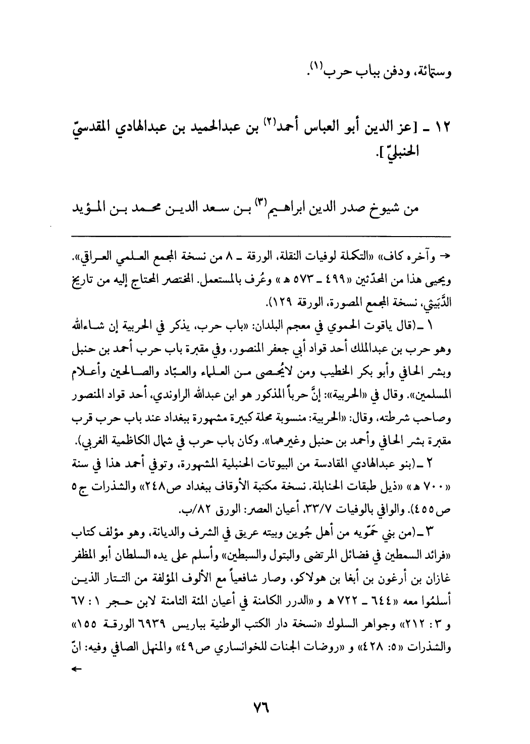 (¬2) (بنو عبد الهادي المقادسة من البيوتات الحنبلية المشهورة، وتوفي أحمد هذا في سنة «700 هـ» «ذيل طبقات الحنابلة. نسخة مكتبة الأوقاف ببغداد ص 248» والشذرات ج 5 ص 455). والوافي بالوفيات 33/ 7، أعيان العصر: الورق /82 ب.