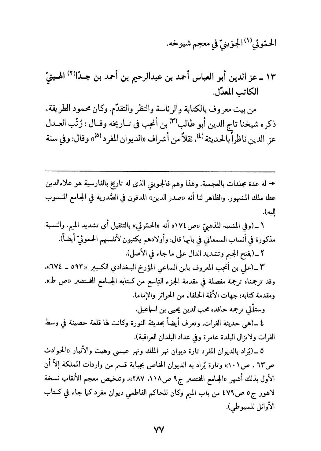 (¬1) (وفي المشتبه للذهبيّ «ص 174» أنه «الحمّوئي» بالتثقيل أي تشديد الميم. والنسبة مذكورة في أنساب السمعاني في بابها قال: وأولادهم يكتبون لأنفسهم الحموئيّ أيضا).