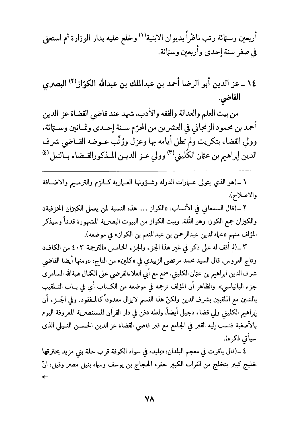 (¬3) (لم أقف له على ذكر في غير هذا الجزء والجزء الخامس «الترجمة 403 من الكاف» وتاج العروس، قال السيد محمد مرتضى الزبيدي في «كلين» من التاج: «ومنها أيضا القاضي شرف الدين ابراهيم بن عثمان الكليني، سمع مع أبي العلاء الفرضي على الكمال هبة الله السامري جزء البانياسي».والظاهر أن المؤلف ترجمه في موضعه من الكتاب أي في باب التلقيب بالشين مع الملقبين بشرف الدين ولكنّ هذا القسم لا يزال معدودا كالمفقود. وفي الجزء أن إبراهيم الكليني ولي قضاء دجيل أيضا، ولعله دفن في دار القرآن المستنصرية المعروفة اليوم بالآصفية فنسب إليه القبر في الجامع مع قبر قاضي القضاة عزّ الدين الحسن النيلي الذي سيأتي ذكره).