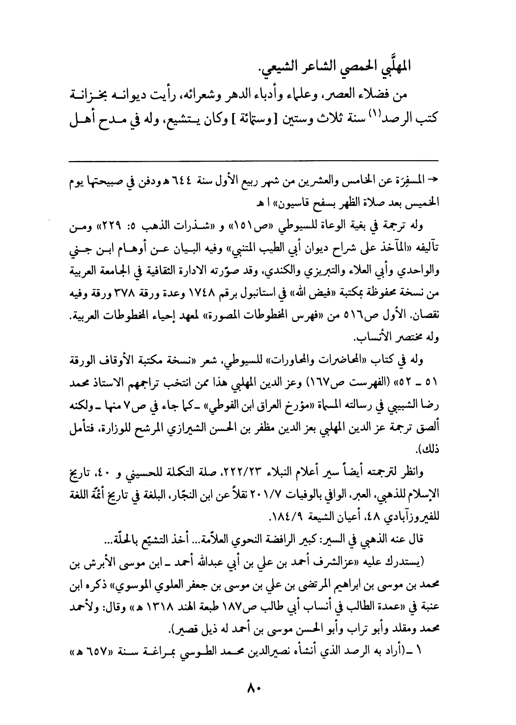 - المسفرة عن الخامس والعشرين من شهر ربيع الأول سنة 644 هـ ودفن في صبيحتها يوم الخميس بعد صلاة الظهر بسفح قاسيون» اهـ وله ترجمة في بغية الوعاة للسيوطي «ص 151» و «شذرات الذهب 5: 229» ومن تآليفه «المآخذ على شراح ديوان أبي الطيب المتنبي» وفيه البيان عن أوهام ابن جني والواحدي وأبي العلاء والتبريزي والكندي، وقد صوّرته الادارة الثقافية في الجامعة العربية من نسخة محفوظة بمكتبة «فيض الله» في استانبول برقم 1748 وعدة ورقة 378 ورقة وفيه نقصان. الأول ص 516 من «فهرس المخطوطات المصورة» لمعهد إحياء المخطوطات العربية. وله مختصر الأنساب. وله في كتاب «المحاضرات والمحاورات» للسيوطي، شعر «نسخة مكتبة الأوقاف الورقة 51 - 52» (الفهرست ص 167) وعزّ الدين المهلبي هذا ممن انتخب تراجمهم الاستاذ محمد رضا الشبيبي في رسالته المسماة «مؤرخ العراق ابن الفوطي» - كما جاء في ص 7 منها - ولكنه ألصق ترجمة عزّ الدين المهلبي بعز الدين مظفر بن الحسن الشيرازي المرشح للوزارة، فتأمل ذلك). وانظر لترجمته أيضا سير أعلام النبلاء 222/ 23، صلة التكملة للحسيني و 40، تاريخ الإسلام للذهبي، العبر، الوافي بالوفيات 201/ 7 نقلا عن ابن النجّار، البلغة في تاريخ أئمّة اللغة للفيروزآبادي 48، أعيان الشيعة 184/ 9. قال عنه الذهبي في السير: كبير الرافضة النحوي العلاّمة ... أخذ التشيّع بالحلّة ... (يستدرك عليه «عز الشرف أحمد بن علي بن أبي عبد الله أحمد - ابن موسى الأبرش بن محمد بن موسى بن ابراهيم المرتضى بن علي بن موسى بن جعفر العلوي الموسوي» ذكره ابن عنبة في «عمدة الطالب في أنساب أبي طالب ص 187 طبعة الهند 1318 هـ» وقال: ولأحمد محمد ومقلد وأبو تراب وأبو الحسن موسى بن أحمد له ذيل قصير).