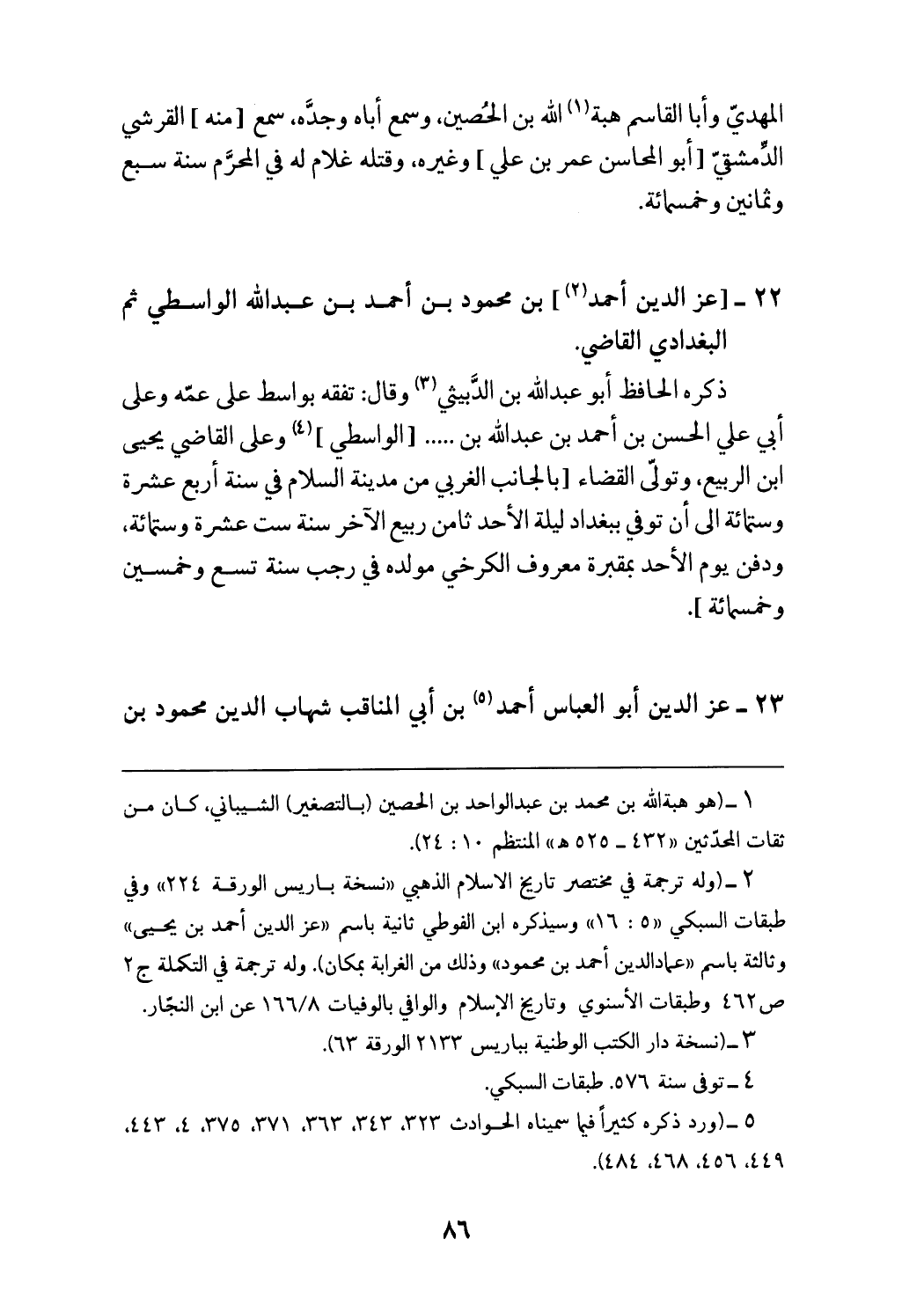 (¬2) (وله ترجمة في مختصر تاريخ الاسلام الذهبي «نسخة باريس الورقة 224» وفي طبقات السبكي «5: 16» وسيذكره ابن الفوطي ثانية باسم «عزّ الدين أحمد بن يحيى» وثالثة باسم «عماد الدين أحمد بن محمود» وذلك من الغرابة بمكان). وله ترجمة في التكملة ج 2 ص 462 وطبقات الأسنوي وتاريخ الإسلام والوافي بالوفيات 166/ 8 عن ابن النجّار.