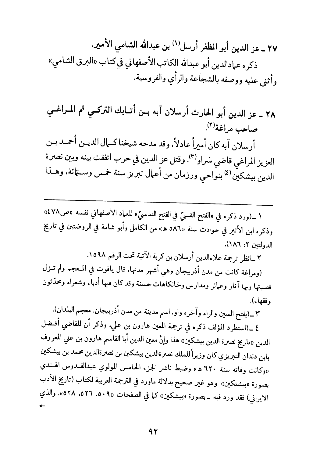 أرسلان آبه كان أميرا عادلا، وقد مدحه شيخنا كمال الدين أحمد بن العزيز المراغي قاضي سراو (¬3). وقتل عزّ الدين في حرب اتفقت بينه وبين نصرة الدين بيشكين (¬4) بنواحي ورزمان من أعمال تبريز سنة خمس وستمائة، وهذا
