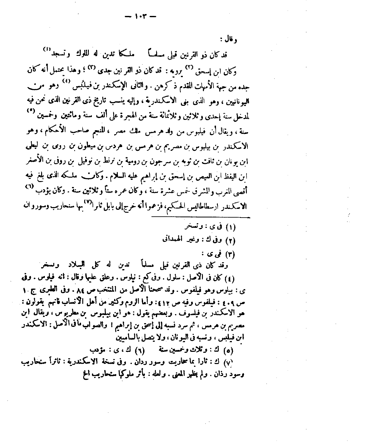 وكان أبن إسحاق يرويه: قد كان ذو القرنين. . . . . . .، وهذا يحتمل أنَّه كان جده من جهة الأمهات المقدم ذكرهن. والثاني الإسكندر بن فليبس وهو من اليونانيين، وهو الذي بنى الإسكندرية، وإليه ينسب تاريخ ذي القرنين الذي نحن