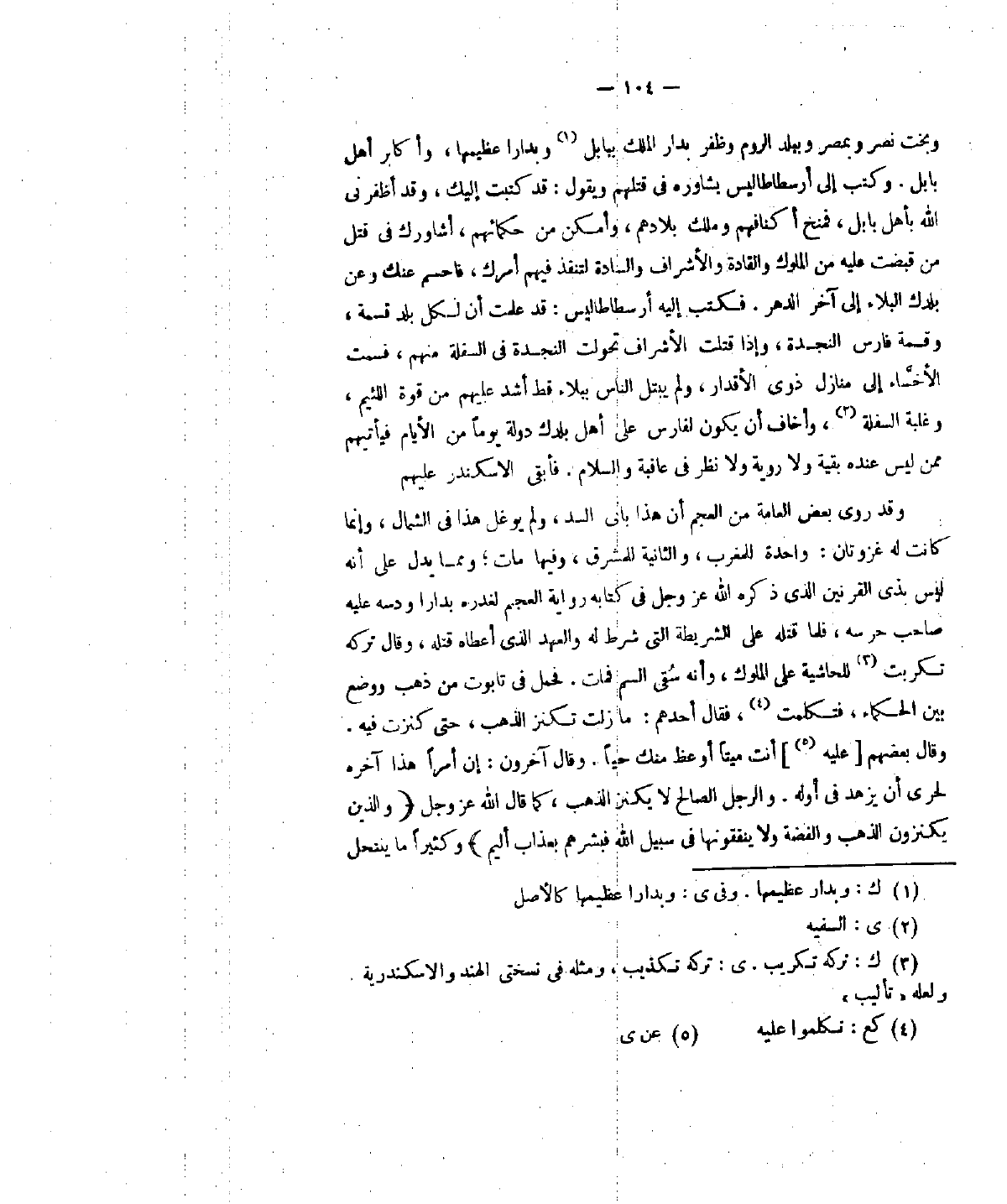 وبخت نصر وبمصر وببلد الروم وظفر بدار الملك ببابل وبدارا عظيمها وأكابر أهل بابل. وكتب إلى أرسطوطاليس يشاوره في قلهم ويقول: قد كتبت إليك، وقد أظفرني الله بأهل بابل، فمنح أكنافهم وملك بلادهم، وأمكن من حكمائهم، وأشاورك في قتل من قبضت عليه من الملوك والقادة والأشراف والسادة لتنفيذ فيهم أمرك، فاحسم عنك وعن بلدك البلاد إلى آخر الدهر. فكتب إليه أرسطوطاليس: قد علمت لكل بلد قسمة، وقسمة فارس النجدة، وإذا قتلت الأشراف تحولت النجدة في السفلة منهم، فسمت الإخاء إلى منازل ذوي الأقدار، ولم يبتل الناس ببلاء أشد عليهم من قوة اللئيم، وغلبة السفلة، وأخاف أنْ يكون لفارس على أهل بلدك دولة يوما من الأيام فيأتيهم ممن ليس عنده بقية ولا روية ولا نظر في. . . . . . . والسلام. فابقي الاسكندر عليهم.