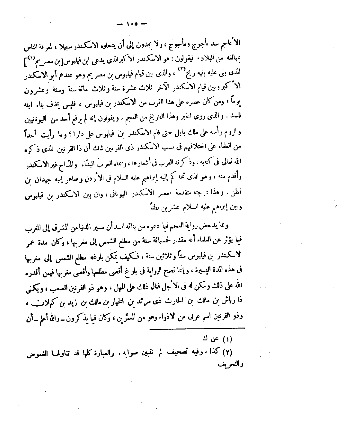 الأعاجم سد يأجوج ومأجوج، ولا يجدون إلى أنَّ ينحلوه الاسكندر سبيلا، لمعرفة الناس بمبالغة من البلاد، فيقولون: هو الاسكندر الأكبر الذي يدعى أبن فيليبوس بن مصريم الذي بنى عليه بنيه ريح، والذي بين قيام فيليبوس بن مصريم وهو عندهم أبو الاسكندر الأكبر وبين قيام الاسكندر الآخر ثلاث عشرة سنة وثلاث مائة وستّة وعشرون يوماً، ومن كان عصره على هذا القرب من الاسكندر بن فيليبوس، فليس يخاف بناء ابنه للسد. والذي روى الخبر وهذا التاريخ من العجم، ويقولون أنَّه لم يرفع أحد من اليونانيين والروم رأسه على ملك بابل حتى قام الاسكندر بن فيلبوس على دارا؛ وما رأيت أحداً من العلماء على اختلافهم في نسب الاسكندر ذي القرنين شك أنَّ ذا القرنين الذي ذكره الله تعالى في كتابه، ذكرته العرب في أشعارها، وسماه العرب البناء، والمسلح غير الاسكندر وأقدم منه، وهو الذي تحاكم إليه إبراهيم عليه السلام في الأردن وصاهر إليه جيدان بن قطن. وهذا درجته متقدمة لعصر الاسكندر اليوناني، وإنَّ بين الاسكندر بن فيلبوس وبين إبراهيم عليه السلام عشرين بطناً