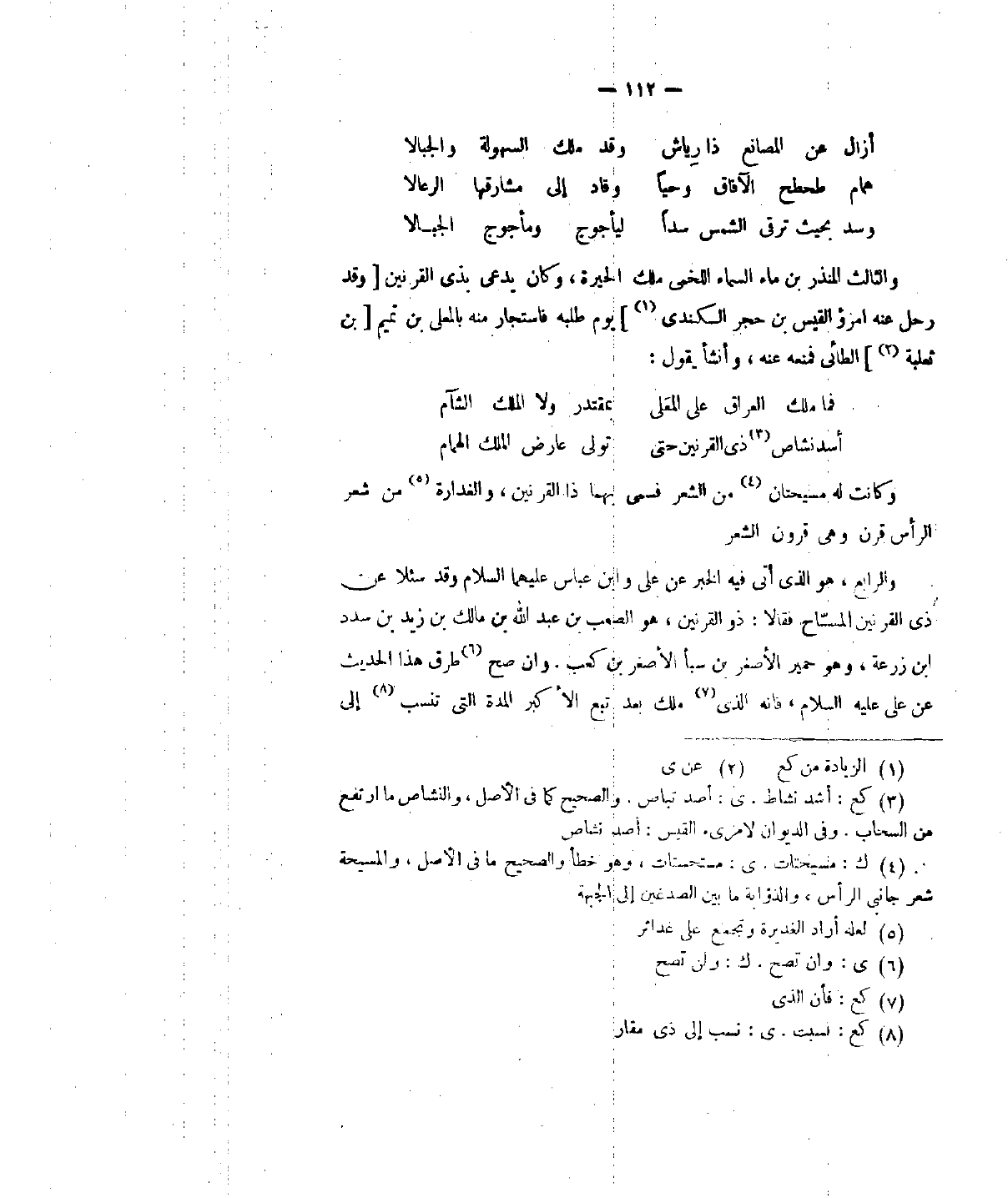 والرابع، هو الذي أتى فيه الخبر عن عليّ وأبن عباس عليهما السلام وقد سئلا عن ذي القرنين الماح، فقالا: ذو القرنين، هو الصعب بن عبد الله بن مالك بن زيد بن سدد أبن زرعة، وهو حمير الأصغر بن سبأ الأصغر بن كعب. وإنَّ صح طرق هذا الحديث عن عليّ عليه السلام، فانه الذي ملك بعد تبع الأكبر المدة التي تنسب إلى