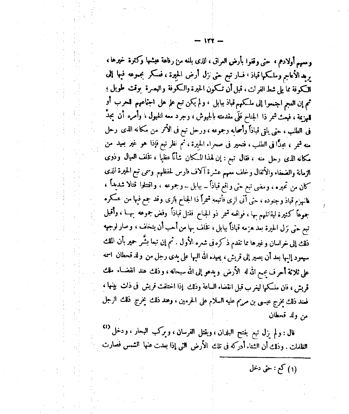 فانهزم قباذ وجنوده، حتى أتى الري فأتبعه ذا الجناح بالري وقد جمع فيها من عسكره جموعا كثيرة ليقاتلهم بها، فواقعه شمر ذو الجناح فقتل قباذا وفض جموعه بها، وأقبل تبع حتى وصل الحيرة بعد هزمه قباذا ببابل، فخلف بها من أحب أنْ يتخلف، وصار لوجهه ذلك إلى خراسان وغيرها مما تقدم ذكره في شعره الأول. ثم إنَّ تبعا بشر حمير بأن الملك سيعود إليه بعد أنْ يصير إلى قريش، ويعيده الله إليها على يدي رجل من ولد قحطان اسمه على ثلاثة أحرف يجمع الله له الأرض ويدعو إلى سبحانه، وذلك عند انقضاء ملك قريش، فإنَّ ملكها ليغرب قبل انقضاء الساعة وذلك إذا اختلف قريش في ذات بينها، فعند ذلك يخرج عيسى بن مريم عليه السلام على الحرمين، وعند ذلك يخرج ذلك الرجل من ولد قحطان.