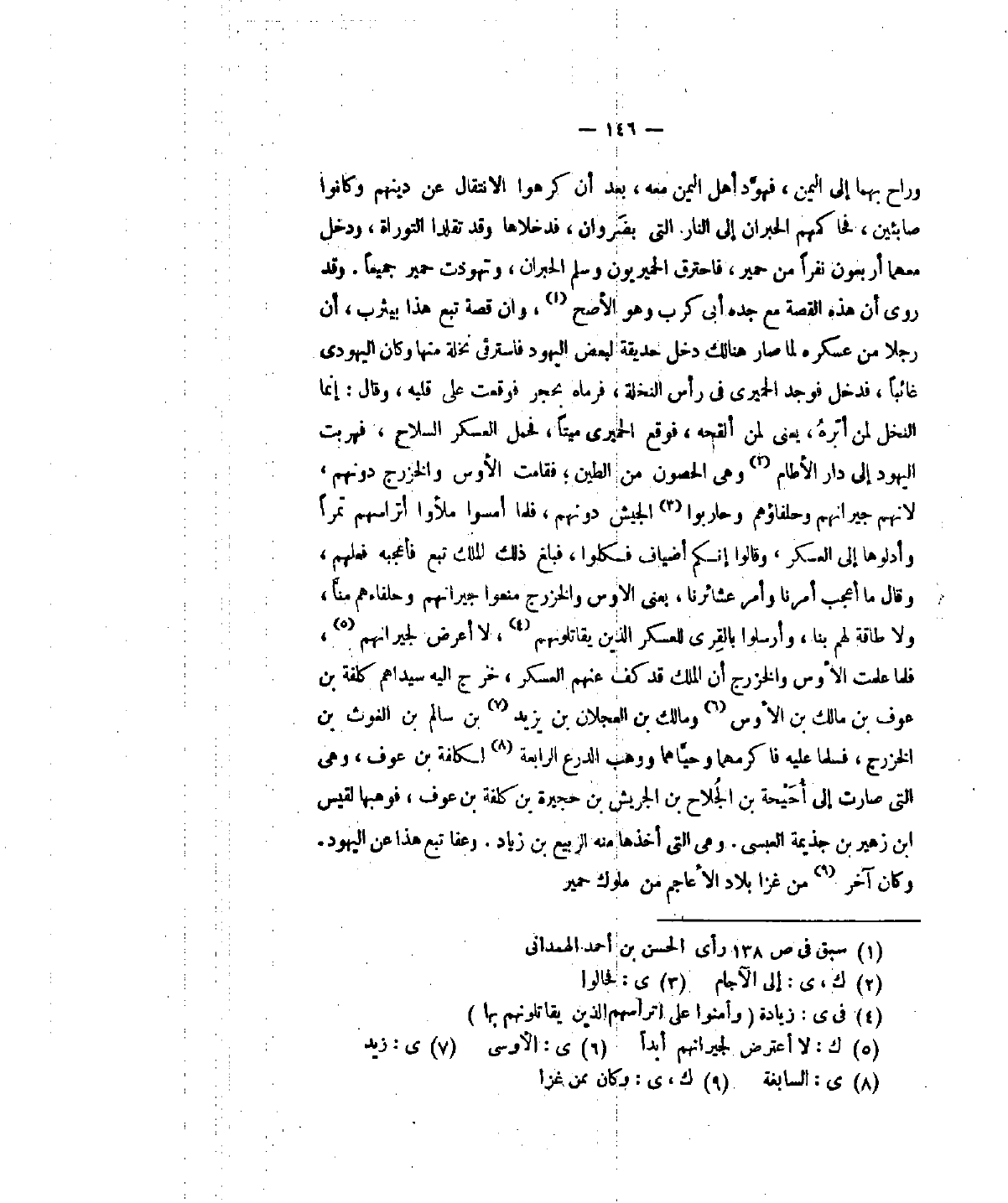 وراج بهما إلى اليمن معه، بعد أن كرهوا الانتقال عن دينهم وكانوا صابئين، فحاكمهم الحبران إلى النار بضروان، فدخلاها وقد تقلدا التوراة، ودخل معهما أربعون من حمير، فاحترق الحميرون وسلم الحبران، وتهودت حمير جميعاً. وقد روى أنَّ هذه القصة مع جده أبي كرب وهو الأصح، وان قصة تبع هذا بيثرب، إنَّ رجلان من عسكره لمّا صار هناك دخل حديقة لبعض اليهود فاسترقى نخلة منها مكان اليهودي غائباً، فدخل فوجد الحميري في رأس النخلة، فرماه بحجر فوقعت على قلبه، وقال: إنّما النخل لمن أبره، يعني لمن ألقحه، فوقع الحميري ميتاً، فحمل عسكر السلاح، فهربت اليهود إلى دار الأطام وهي الحصن من الطين؛ فقامت الأوس والخزرج دونهم، لأنهم جيرانهم وحلفائهم، فلما أمسوا ملأوا أتراسهم تمراً وأدلوا إلى العسكر، وقالوا إنكم أضياف فكلوا، فبلغ ذلك الملك تبع فأعجبهم فعله، وقال ما أعجب أمرنا وأمر عشائرنا، يعني الأوس والخزرج منعوا جيرانهم وحلفاءهم منا، ولا طاقة لهم بنا، وأرسلوا بالقرى للعسكر الذين يقاتلونهم، لا أعتراض لجيرانهم، فلما علمت الأوس والخزرج أنَّ الملك قد كف عنهم العسكر، خرج إليه سيدهم كلفة بن عوف بن مالك لن الأوس ومالك بن العجلان بن يزيد بن سالم بن الغوث بن الخزرج، فسلما عليه فاكرمهما وحياهما ووهب الدرع الرابعة لكلف بن عوف، وهي التي صارت إلى أحيحة بن الجلاح بن الجريش بن حجيرة بن كلفة بن عوف، فوهبها لقيس بن زهير بن جذيمة العبسي. وهي التي أخذها منه الربيع بن زياد. وعفا تبع هذا عن اليهود. وكان آخر من غزا بلاد الأعاجم من ملوك حمير