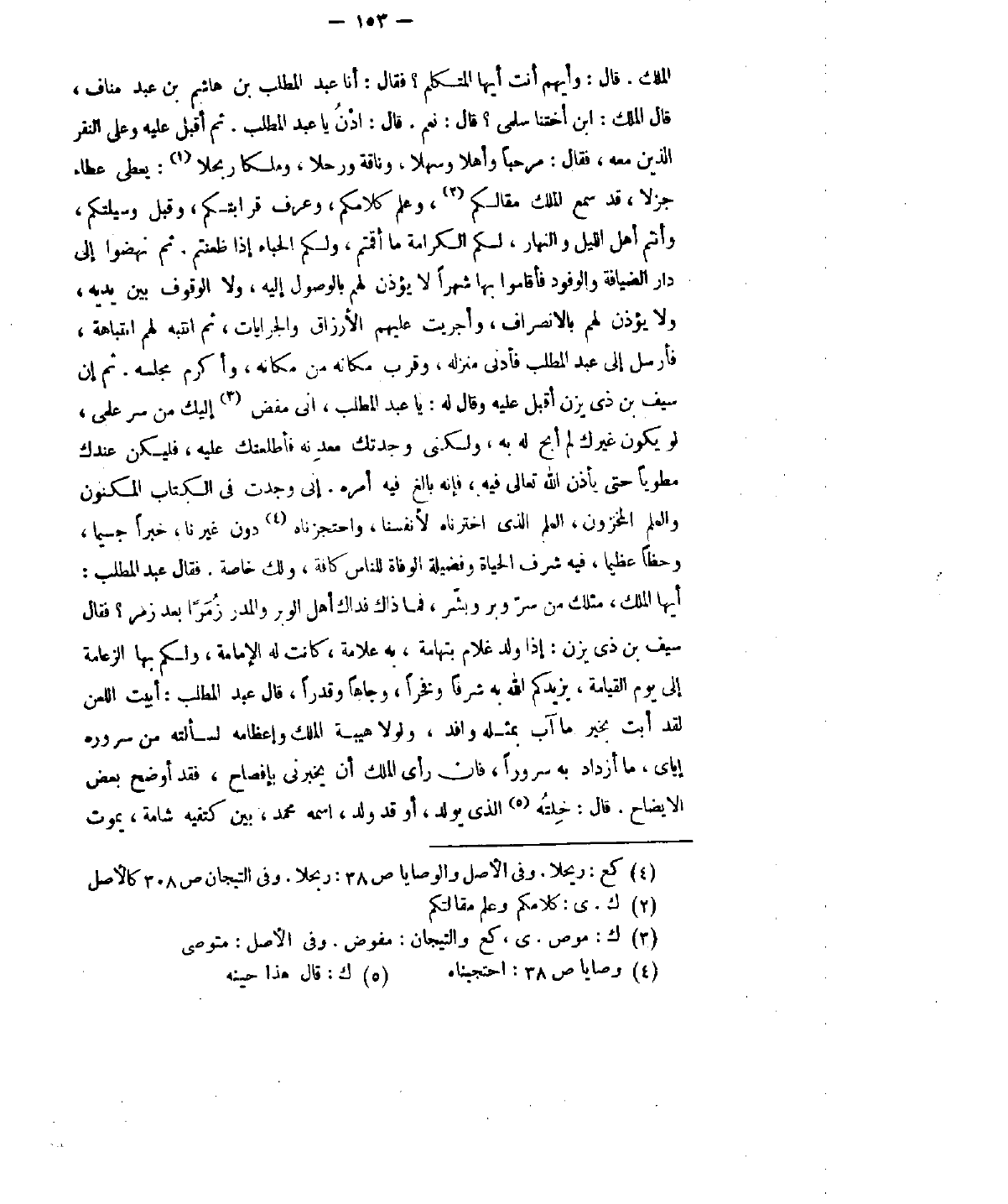 المخزون، العلم الذي اخترناه لأنفسنا، واحتجزناه دون غيرنا، خبراً جسيما، وحظاً عظيماً، فيه شرف الحياة وفضيلة الوفاء لناس كافة، ولك خاصة. فقال عبد المطلب: أيها الملك، مثلك من سر وبر وبشر، فما ذلك فداك أهل الوبر والمدر زمراً بعد زمر؟ فقال سيف الدين بن ذي يزن: إذا ولد غلام بتهامة، به علامة، كانت له الإمامة، ولكم بها الزعامة إلى يوم القيامة، يزيدكم الله به شرفا وفخراً، وجاهاً وقدراً، قال عبد المطلب: أبيت اللعن لقب أبت بخير ما آب بمثله وافد، ولولا هيبة الملك وإعظامه لسألته من سروره إياي، ما أزداد به سروراً، فأن رأى الملك إنَّ يخبرني بإفصاح، فقد أوضح بعض الإيضاح. قال: خلته الذي يولد، أو قد ولد، اسمه محمّد بين كتفيه شامة، يموت