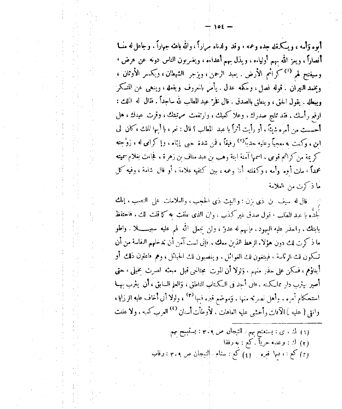 أبوه وأمه، ويكفله جده وعمه، وقد ولدناه مراراً، والله باعثه جهاراً، وجاعل له منا أنصاراً، ويعز الله بهم أولياءه، ويذل بهم أعدائه، ويضربون الناس دونه عن عرض، وسيفتح لهم كرائم الأرض. يعبد الرحمن، ويزجر الشيطان، ويكسر الأوثان، ويخمد النيران. وقوله فصل، وحكمه عدل، يأمر بالمعروف ويفعله، وينهى عن المنكر ويبطله. ويقول الحق، وينطق بالصدق. قال فخر عبد المطلب لله ساجداً. فقال له الملك: ارفع رأسك، فقد ثلج صدرك، وعلا كعبك، وارتفعت مرتبتك، وقرت عينك، هل أحسست من أمره شيئاً، أو رأيت أثراً يا عبد المطلب؟ قال: نعم، يا أيّها الملك، كان لي أبن، وكنت به معجباً وعلبه حدباً رفيقا، من شدة حبي إياه، وإكرامي به، زوجته كريمة من كرائم قومي، اسمها أمنه بنت وهب بن عبد مناف بن زهرة، فجاءت بغلام سميته محمّداً، مات أبوه وأمه، وكفلته أنا وعم، بين كتفيه علامة، أو قال شامة، وفيه كل ما ذكرت من العلامة