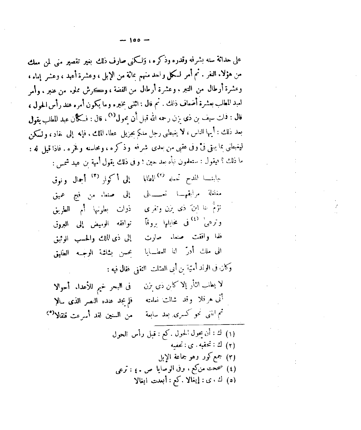 على حداثة سنه بشرفه وقدره وذكره، ولكني صارف ذلك بغير تقصير مني لمن صك من هؤلاء النفر. ثم أمر لكل واحد منهم بمائة من الإبل، وعشرة أعبد، وعشرة. .، وعشرة أرطال من التبر، وعشرة أرطال من الفضة، وكرش مملوء من عنبر، يأمر لعبد المطلب بعشرة أضعاف ذلك. ثم قال: ائتني بخبره وما يكون أمره سد رأس لحول، قال: فمات سير بن ذي يزن رحمه الله قبل إنَّ يحول، قال: فكان عبد المطلب يقول بعد ذلك: أيها الناس، لا يغبطني رجل منكم بجزيل عطاء الملك، فأنه إلى نفاد، ولكن ليغبطني بما يبقى في عقبي من بعدي شرفه وذكره، ومحاسنه وفخره. فإذا قيل له: ما ذلك؟ فيقول: ستعلمون نبأه بعد حين؛ وفي ذلك يقول أميه بن عبد شمس: