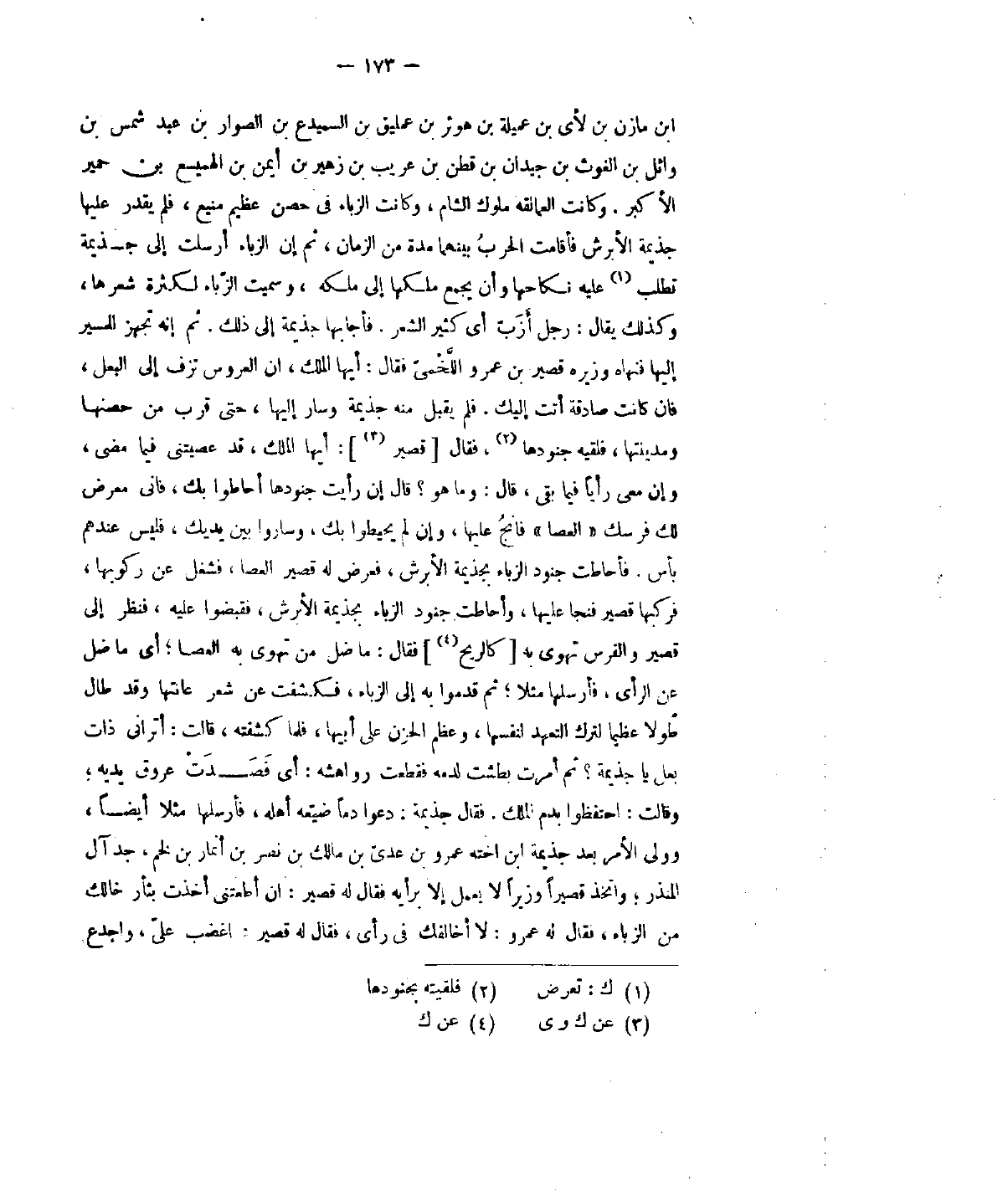 الصوار بن عبد شمس بن وائل بن الغوث بن جيدان بن قطن بن عريب بن زهير بن أيمن بن الهميسع بن حمير الأكبر. وكانت العمالقة ملوك الشام، وكانت الزباء في حصن عظيم منيع، فلم يقدر عليها جذيمة الأبرش فأقامت الحرب بينتهما مدة من الزمان، ثم إنَّ الزباء أرسلت إلى جذيمة تطلب عليه نكاحها وأن يجمع ملكها إلى ملكه، وسميت الزباء لكثرة شعرها، وكذلك يقال: رجل أزب أي كثير الشعر. فأجابها جذيمة إلى ذلك. ثم أنَّه تجهز للمسير إليها فنهاه وزيره قصير بن عمرو اللخمي فقال: أيّها الملك، إنَّ العروس تزف إلى البعل، فإنَّ كانت صادقة أتت إليك. فلم يقبل منه جذيمة وسار إليها حتى قرب من حصنها ومدينتها، فلقيه جنودها، فقال قصير: أيّها الملك، قد عصيتني فيما مضى، وان معي رأياً فيما بقى، قال: وما هو؟ قال إنْ رأيت جنودها أحاطوا بك، فإني معرض لك فرسك العصا فانج عليها، وإن لم يحيطوا بك، وساروا بين يديك، فليس عندهم بأي. فأحاطت جنود الزباء بجذيمة الأبرش، فعرض له قصير العصا، فشغل عن ركوبها، فركبها قصير فنجا عليها، وأحاطت جنود الزباء بجذيمة الأبرش، فقبضوا عليه، فنظر إلى قصير والفرس تهوي به كالريح فقال: ما ضل من تهوى به العصا؛ أي ما ضل عن الرأي، فأرسلها مثلاً؛ قدموا به إلى الزباء، فكشفت شعر عانتها وقد طال طولا عظيماً لترك التعهد لنفسها، وعظم الحزن على ابيها، فلما كشفته، قالت: أتراني ذات بعل يا جذيمة؟ ثم أمرت بطشت لدمه فقطعت رواشيه: أي فصدت عروق يديه؛ وقالت: احتفظوا بدم الملك. فقال جذيمة: دعوا دماً ضيعه أهله، فأرسلها مثلاً أيضاً، وولى الأمر بعد جذيمة أبن أخته عمرو بن عدي بن مالك بن نصر بن أنمار بن لخم، جد آل المنذر؛ واتخذ قصيراً وزيراً لا يعمل إلاّ برأيه فقال قصير: إنَّ أطعتني أخذت بثار خالك من الزباء، فقال له عمرو: لا أخالفك في رأي، فقال له قصير: اغضب عليّ، واجدع