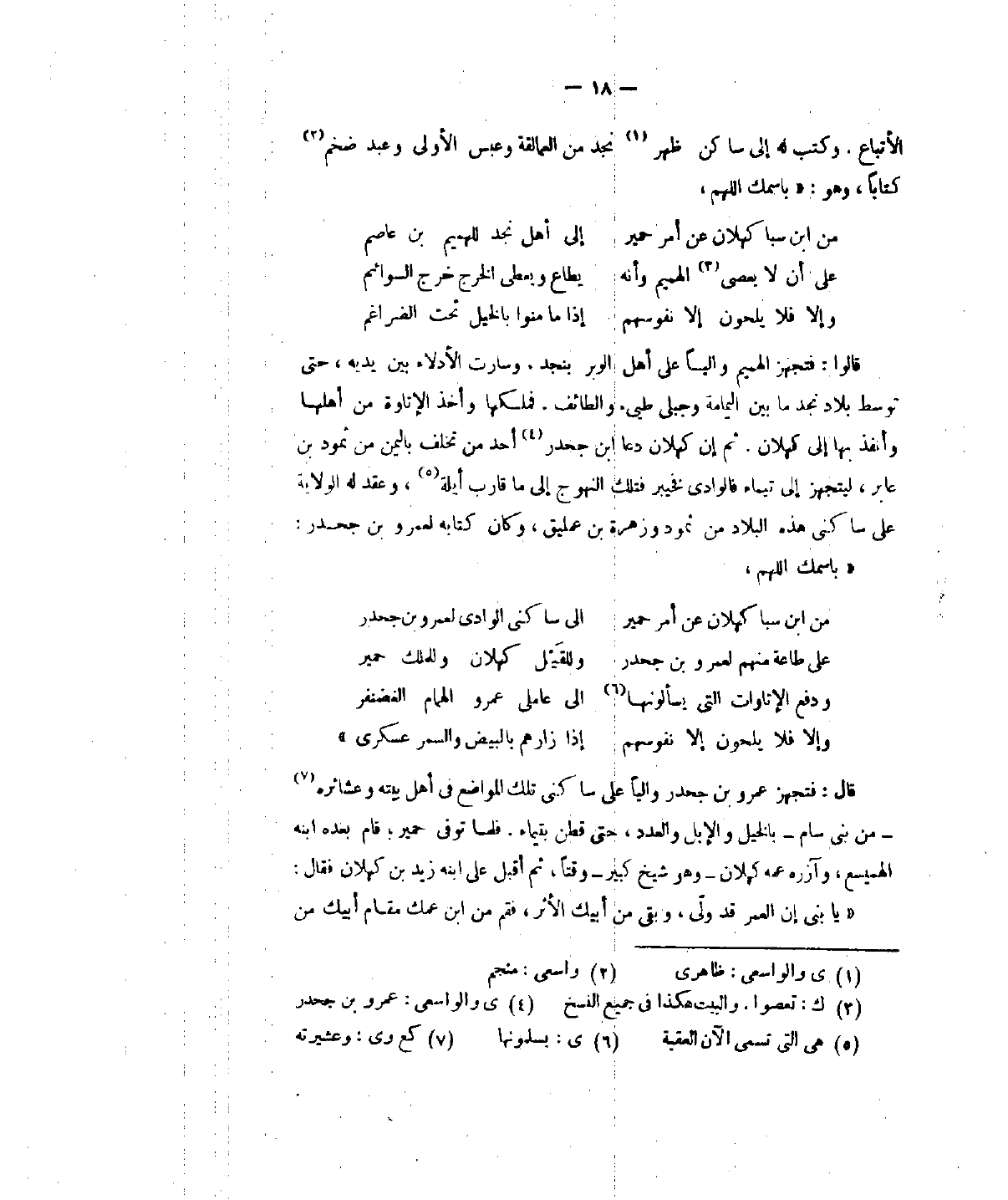الأتباع. وكتب له إلى سكان ظهر نجد من العمالقة وعبس الأول وعبد ضخم كتاباً، وهو: باسمك اللهم.