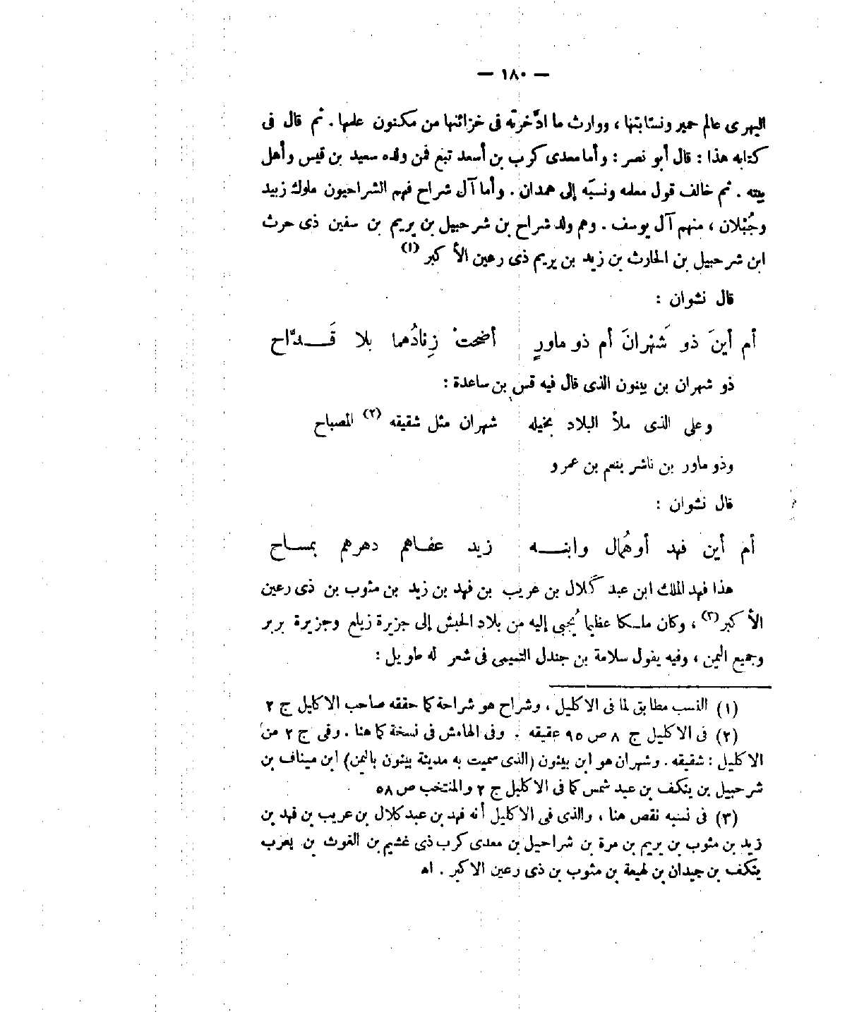 اليهري عالم حمير ونسابها، ووارث ما أدخرته في خزائنها من مكنون علمها. ثم قال في كتابه هذا: قال أبو نصر: وأما معدي كرب بن أسعد تبع سعيد بن قيس وأهل بيته. خالف قول معلمه ونسبه إلى همدان. وأما آل شراح فهم الشراحيين ملوك زبيد وجبلان، منهم آل يوسف. وهم ولد شراح بن شرحبيل بن يريم بن سفين ذي حرث أبن شرحبيل بن الحارث بن زيد بن يريم ذي رعين الأكبر.