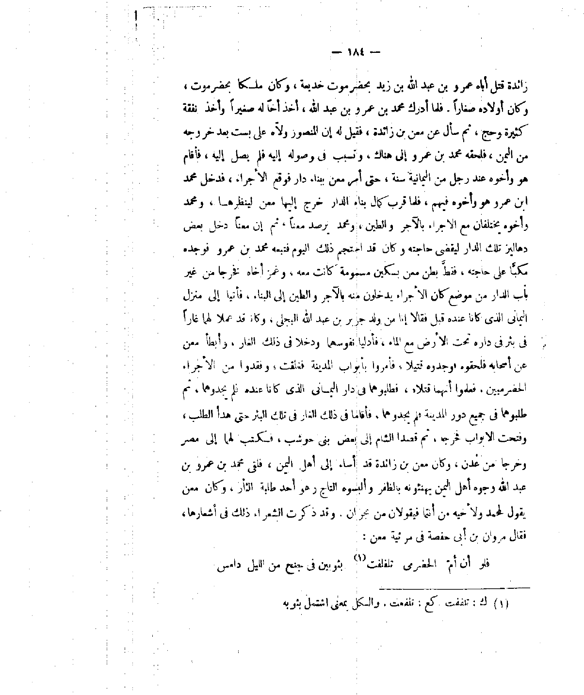 زائدة قتل أباه عمرو بن عمرو بن عبد الله بن زيد بحضرموت خديعة، وكان ملكا بحضرموت، وكان أولاده صغارا. فلما أدرك محمّد بن عمرو بن عبد الله، أخذ أخا له صغيرا وأخذ نفقة كثيرة وحج، ثم سأل عن معن بن زائدة، فقيل له إنَّ المنصور ولاه على بست بعد خروجه من اليمن، فلحقه محمّد بن عمرو إلى هناك، وتسبب في وصوله إليه فلم يصل إليه، فأقام هو أخوه عند رجل من اليمانية سنة، حمير أمر معن ببناء. . . فوقع الأجراء، فدخل محمّد أبن عمرو هو وأخوه فيهم، فلما قرب كمال بناء الدار. . . إليها معن لينظرها، ومحمّد وأخوه بختلفان مع الاجراء بالآجر والطين ومحمّد يرصد معنا، ثم إنَّ معنا دخل بعض دهاليز تلك الدار ليقضي حاجته وكان قد احتجم ذلك اليوم فتبعه محمّد بن عمرو فوجده مكبا على حاجته، فقط بطن معن بسكين مسمومة كانت معه، وغمز أخاه فخرجا من غير باب الدار من موضع كان الأجراء يدخلون منه بالآجر والطن إلى البناء إلى منزل اليماني الذي كانا عنده فقالا إنا من ولد جرير بن عبد الله البجلي، وكانا قد عملا لهما غارا في بئر داره تحت الأرض مع الماء، فأدليا نفوسهما ودخلا في ذلك الغار، وأبطأ معن عن أصحابه فلحقوه فوجدوه قتيلا، فأمروا بأبواب المدينة فغلقت، وفقدوا من الأجراء الحضرميين، فعلموا أنهما قتلاه، فطلبوهما في دار اليماني الذي كانا عنده فلم يجدوهما، ثم طلبوهما في جميع دور المدينة فلم يجدوهما، فأقاما في ذلك الغار في تلك البئر حتى هدأ الطلب، وفتحت الأبواب فخرجا، ثم قصدا الشام إلى بعض بني حوشب، فكتب لهما إلى مصر وخرجا من عدن، وكان معن بن زائدة قد أساء إلى أهل اليمن، فلقي محمّد بن عمرو بن عبد الله وجوه أهل اليمن يهنئونه بالظفر وألبسوه التاج وهو طلبة الثأر، وكان معن يقول لمحمد ولأخيه من أنتما فيقولان من