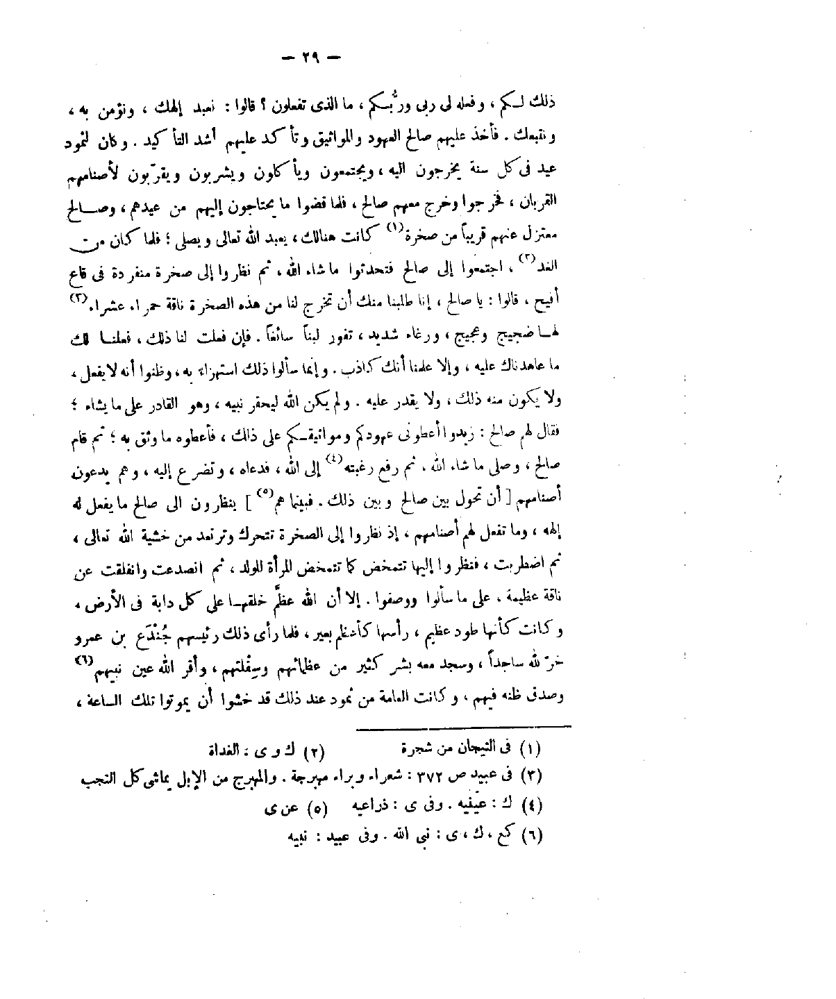 ذلك لكم، وفعله لي ربي وربكم، ما الذي تفعلون؟ قالوا: نعبد إلهك، ونؤمن به، ونتبعك. فأخذ عليهم صالح العهود والمواثيق وتأكد عليهم أشد التأكيد. وكان لثمود عيد في كل سنة يخرجون إليه، يجتمعون، ويأكلون، ويشربون، ويقربن لأصنامهم القربان، فخرجوا وخرج معهم صالح، فلما قضوا ما يحتاجون إليه من عيدهم، وصالح معتزل عنهم قريب من صخرة كانت هنالك، يعبد الله تعالى، فلما كان من الغد، اجتمعوا إلى صالح فتحدثوا ما شاء الله، ثم نظروا إلى صخرة منفردة في قاع أفيق، قالوا: يا صالح، إنا نطلب منك أنْ تخرج لنا من هذه الصخرة ناقة حمراء عشراء لها ضجيج وعجيج، ورغاء شديد، تفور لبنا سائغا. فإن فعلت لنا ذلك، فعلنا لك فعلنا لك عاهدناك عليه، وإلاّ علمنا