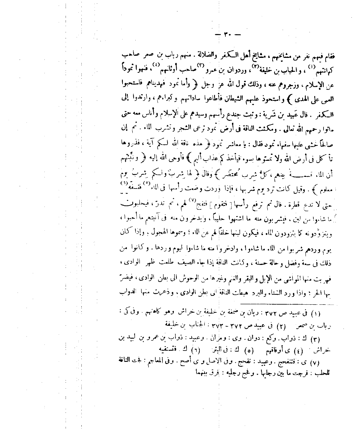 فقام فيهم نفر من مشايخهم، مشايخ أهل الكفر والضلالة. ومنهم رباب بن صعر صاحب كهناهم، والحباب بن خليفة، وردوان بن عمرو صاحب أورثناهم، فنهوا ثمودا عن الإسلام وزجروهم عنهم، وذلك قول الله عز وجل (وأما ثمود فهديناهم فاستجابوا العمى على الهدى). واستحوذ عليهم الشيطان فأعطوا ساداتهم وكبرائهم، وارتدوا إلى الكفر عبيد بن شرية: وثبت جند رأسهم وسيدهم على الإسلام وأناس معه حمير ماتوا رحمهم الله تعالى. ومكنت الناقة في أرض ثمود ترعى الشجر وتشرب الماء. ثم أنْ صالحا خشى عليها سفهاء ثمود فقال: يا معاشر ثمود (هذه ناقة الله لكم أية، فذروها تأكل من أرض الله ولا تمسوها فيأخذكم عذاب أليم) فأوحى الله إليهم (ونبئهم أنْ. . . . . . بينهم، كل شرب مخضر) وقال (لها شرب ولكم شرب يوم معلوم). وقيل كانت يوم شربها، فإذا وردت وضعت رأسها في الماء فتسفه حمير لا تدع قطرة. قال ثم ترفع رأسها فتقوم فتفجع لهم، ثم تدر، فيحلبون ما شاءوا من اللبن، فيشربون منه، ما اشتهوا حليبا، ودخرون منه في آنيتهم ما أحبوا، ويتزودونه كما يتزودون الماء، فيكون لبنها خلفا لهمعن الماء، وسموها الهجول وإذا كان يوم وردهم شربوا من الماء ما شاءوا، وادخروا منه ما شاءوا ليوم وردها. وكانوا من ذلك في سعة وفضل وحالة حسنة، وكانت الناقة إذا جاء الصيف طلعت ظهر الوادي، فهربت منها المواشي من الإبل والبقر والغنم