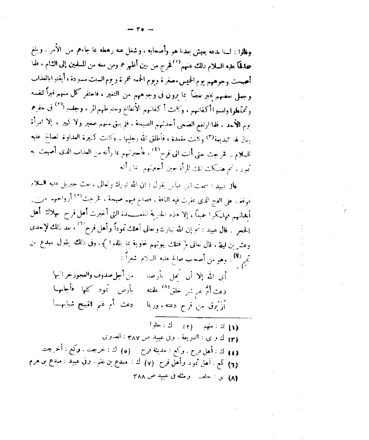 أرواحهم من أبدانهم فهلكوا جميعاً، إلاّ هذه الجارية المقعدة التي أخبرت أهل قرح بهلاك أهل الحجر. قال عبيد: ثم إنَّ الله تبارك وتعالى اهلك ثمود وأهل قرح، وبعد ذلك لإحدى وعشرين ليلة، قال تعالى (فتلك بيوتهم خاوية بما ظلموا)، وفي ذلك يقول مبدع بن تميم؛ وهو من أصحاب صالح عليه السلام شعراً: