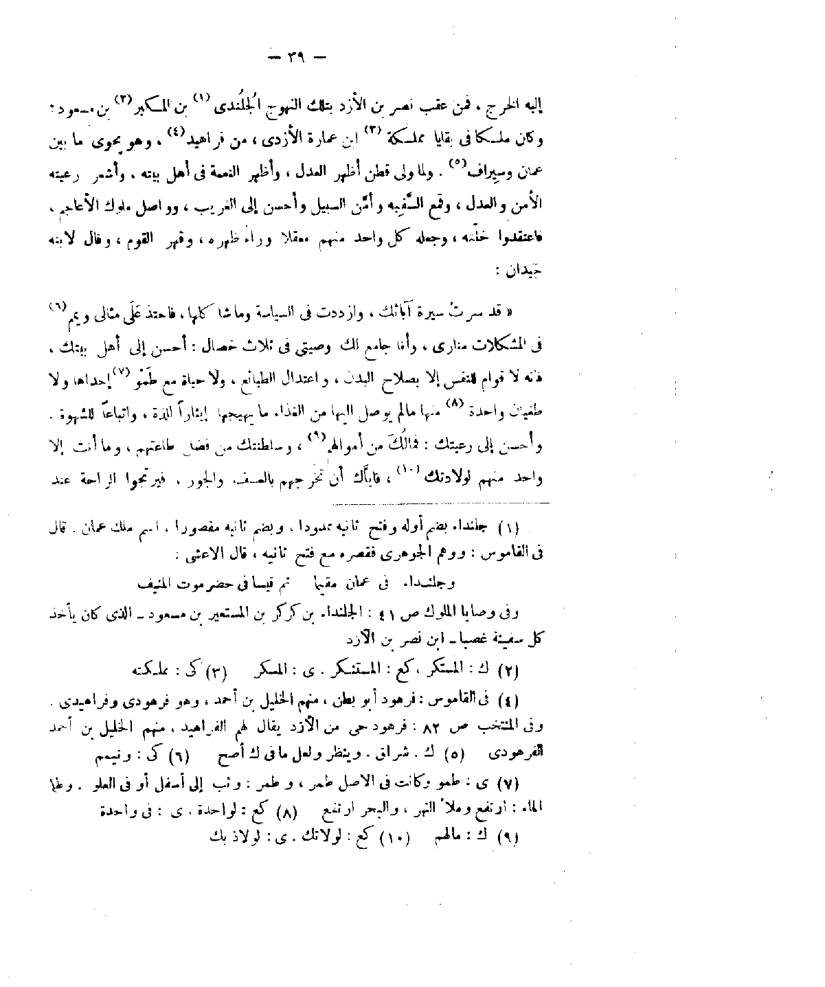 إليه الخرج، فمن عقر نصب بن الأزد بتلك النهوج الجلندي بن المكبر بن مسعود، وكان ملكا في بقايا مملكة أبن عمارة الأزدي، من فراهيد، وهو يحوي ما بين عمان وسيراف. و. . . . . . قطن أظهر العدل، وأظهر النعمة في أهل بيته، وأشعر. . . . الأمن والعدل، وقمع السفيه وأمن السبيل وأحسن إلى الغريب، وواصل ملوك الأعاجم، فاعتقدوا خلته، وجعله كل واحد منهم معقلا وراء ظهره، وقهر القوم، وقال لابنه جيدان: