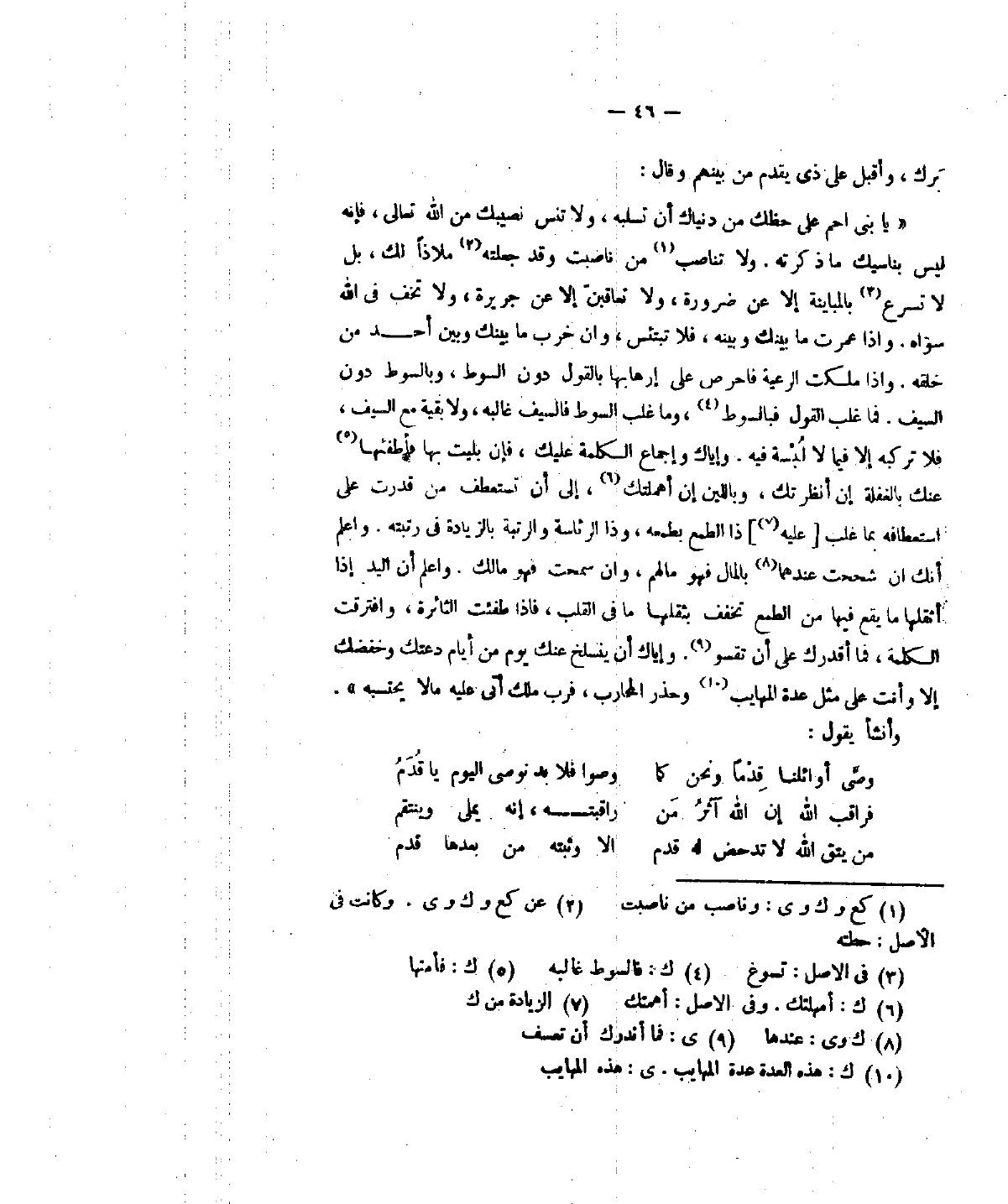 يا بني رحم على حفظك من دنياك أنْ تسلبه، ولا تنس من الله تعالى، فانه. . . يناسيك ذكرته. ولا تناصب من ناصبت وقد جعلته ملاذا. . . . . . .، بل لا تسرع بالمباينة عن ضرورة، ولا تعاقبن إلاّ عن جريرة، ولا تخف في الله سواه. وإذا عمرت ما بينك وبينه، فلا تبتئس، وأنْ خرب ما بينك وبين أحد من خلقه. وإذا ملكت الرعية فاحرص على إرهابها دون السوط، وبالسوط دون السيف. فما غلب القول فبالسوط، وما غلب السوط فالسيف غالبه، ولا بقية مع السيف، فلا تركبه إلاّ فيما لا لبسة فيه. وإياك وإجماع الكلمة عليك، فإنَّ بليت فأطفئها عنك بالغفلة إنْ أنظرتك، وباللين إنْ أهملتك، إلى أنْ تستعطف من قدرت على استعطافه بما غلب عليه ذا الطمع، وذا الرئاسة والرتبة بالزيادة في رتبته. واعلم أنك إنْ شححت عندهما بالمال، هو مالهم، وإنْ سمحت فهو مالك. واعلم أنْ اليد إذا أثقلها ما يقع فيها من الطمع تخفف بثقلها ما في القلب، فإذا طفئت الثائرة، وافترقت الكلمة، فما أقدرك على أنْ تقسو. وإياك أنْ ينسلخ عنك يوم من أيام دعتك وحفضك إلاّ وأنت على مثل عدة المهايب وحذر المحارب، فرب ملك أتى عليه مالا يحسبه.