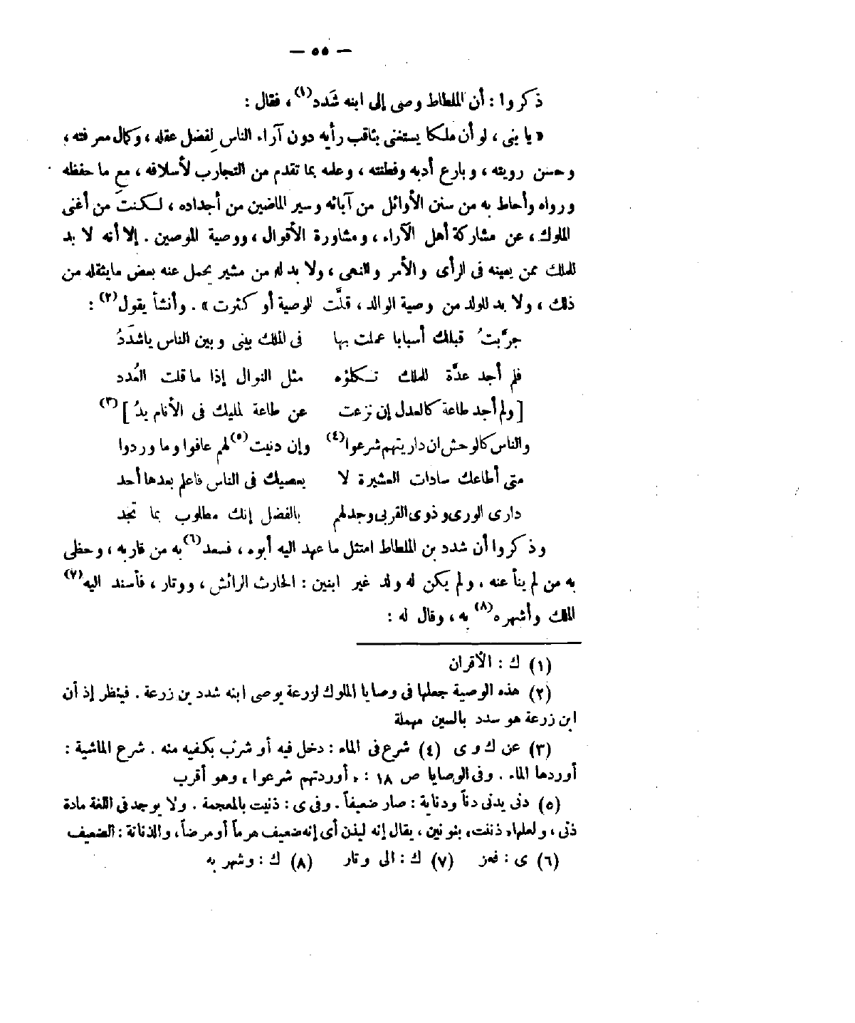 يا بني، لو أنَّ ملكا يستغنى بثاقب رأيه دون آراء الناس لفضل عقله، وكمال معرفته، وحسن رويته، وبارع أدبه وفطنته، وعلمه بما تقدم من التجارب لأسلافه، مع حفظه ورواه وأحاط به من سنن الأوائل من آبائه وسير الماضين من أجداده، لكنت من أغنى الملوك، عن مشاركة أهل الآراء، ومشاورة الأقوال، ووصية الموصين إلاّ أنه لا بد للملك ممن يعينه في الرأي والأمر والنهى، ولا بد له من مشير يحمل عنه مض ما يثقله من ذلك، ولا بد المولد من وصية الوالد، قلت الوصية أو كثرت. وأنشأ يقول: