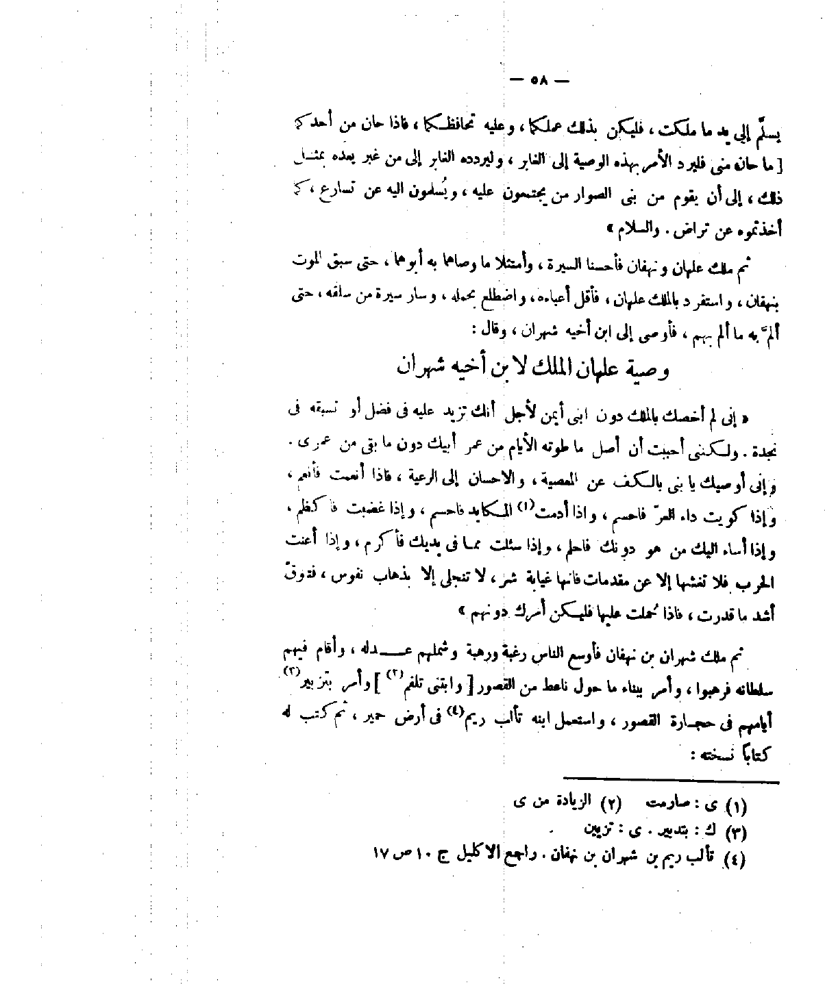 ثم ملك علهان ونهفان فأحسنا السيرة، وأمتثلا ما وصاهما به أبوهك، حمير سبق الموت بنهفان، واستقر بالملك علهان، فأقل أعباءه، واضطلع بجمله، وسار سيرة من سلفه، حمير ألم به ما ألم بهم، فأوصى إلى أبن أخيه شهران، وقال: