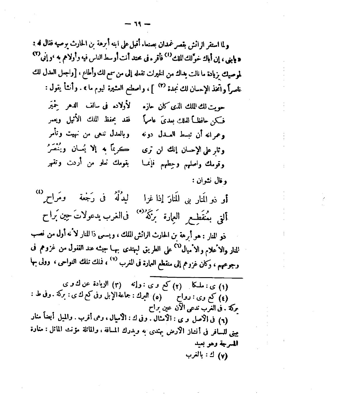 ولمّا استقر الرائش بقصر غمدان بصنعاء أقبل على ابنه أبرهة بن الحارث يوصيه فقال له: يا بني، إنَّ أباك خولك الملك فأقره في محتد أنت أوسط الناس فيه وأولاهم به، وإني لموصيك بزيادة ما نالت يداك من الخيرات تفعله إلى من سمع لك وأطاع، واجعل العدل لك ناصراً وخذ الإحسان لك نجدة، واصطنع العشيرة ليوم ما. وأنشأ يقول: